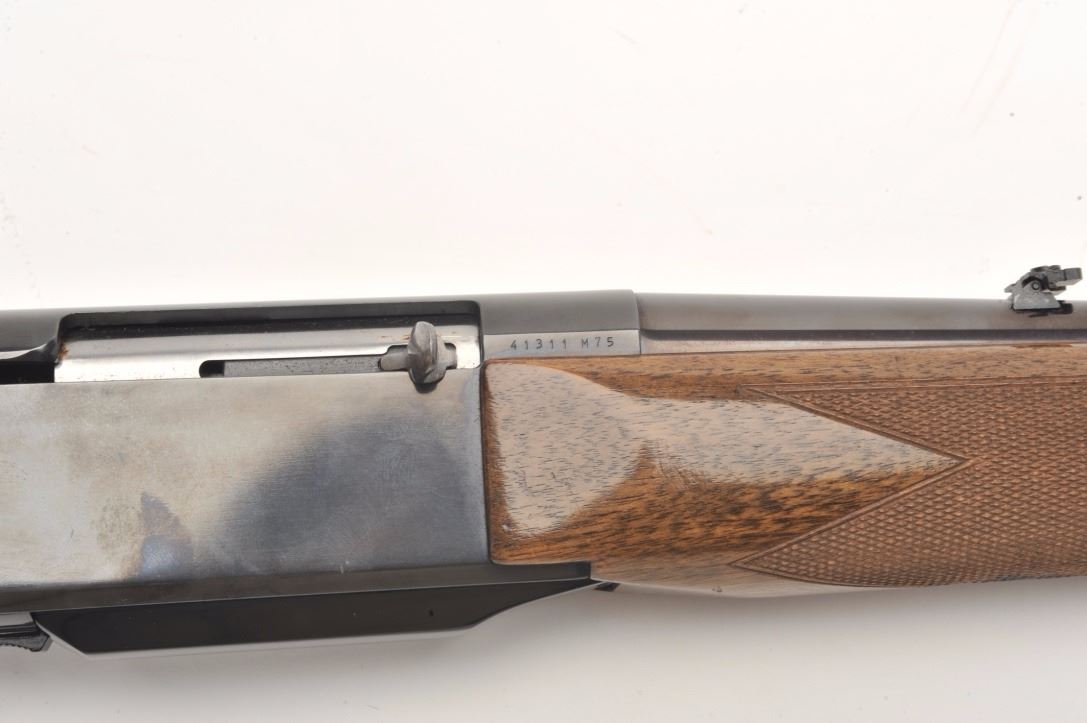 Belgium Browning Semi-Auto rifle in .30-06, S/N 41311M75. In near fine used condition showing 96%-98% blue showing minor marks on stocks, and slight staining. Good original butt plate. (Modern) Est.: $500-$1000