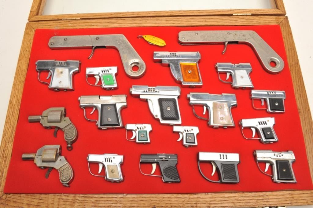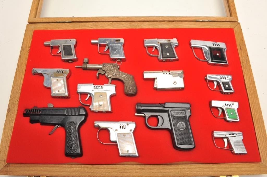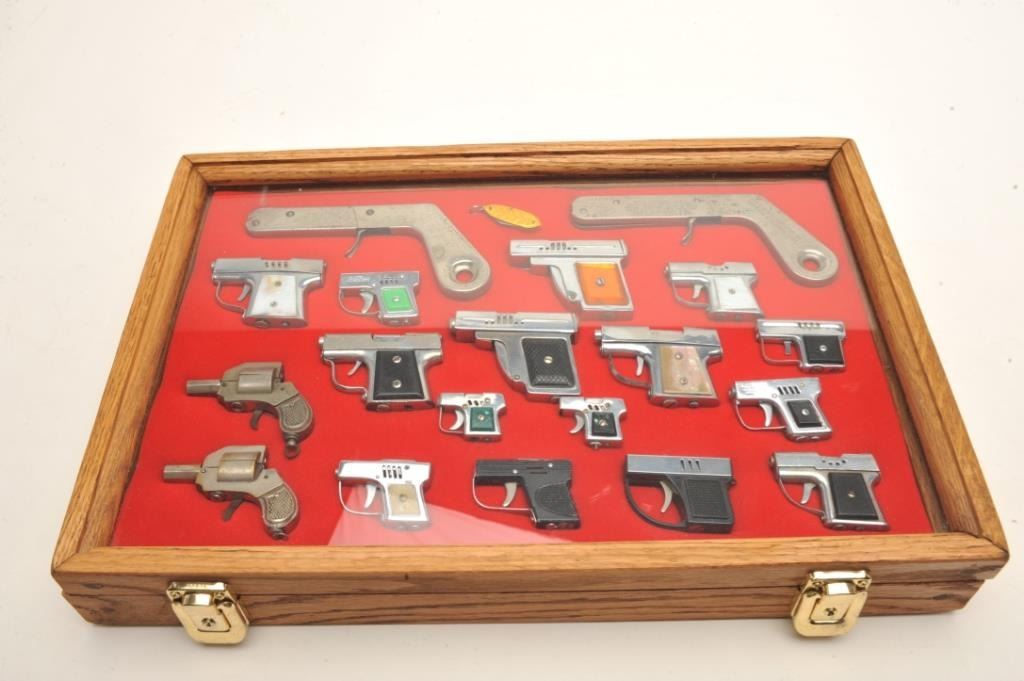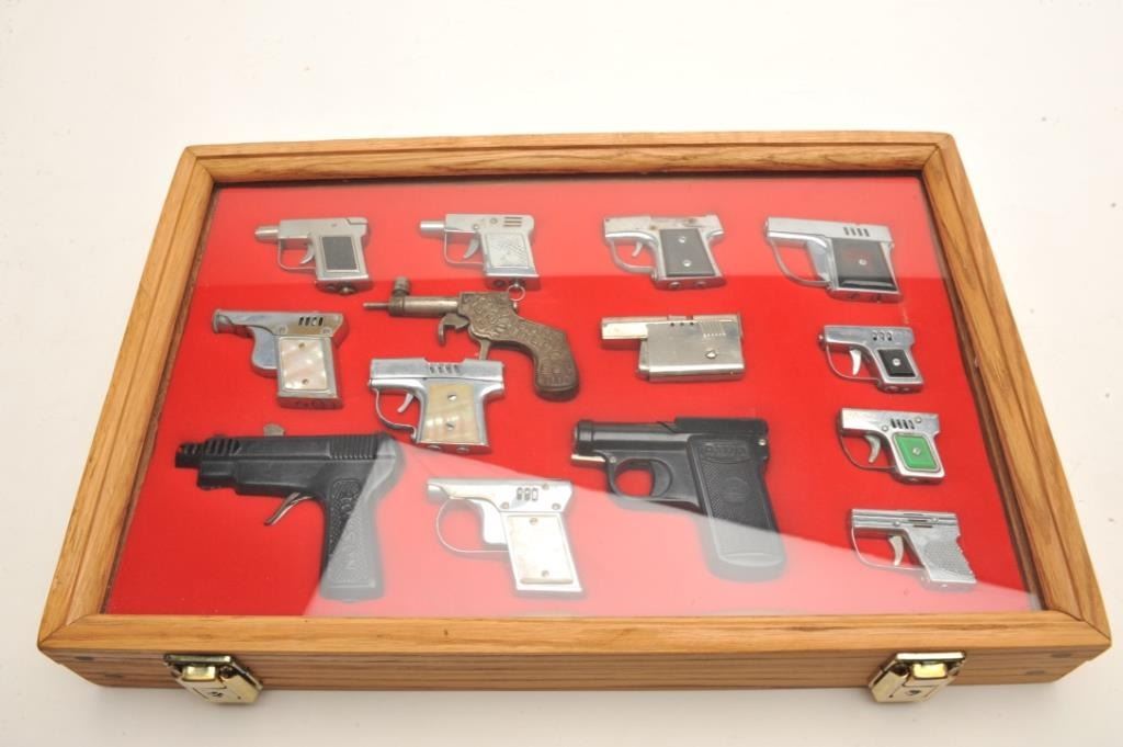 Lot of 33 lighters in 2 wood and glass display cases; a lifetime collection with great variety in form, size, grip composition, etc. (Reference: James Flanagan’s definitive work “The Big Book ofCigarette Lighters”). Est.: $450-$600.