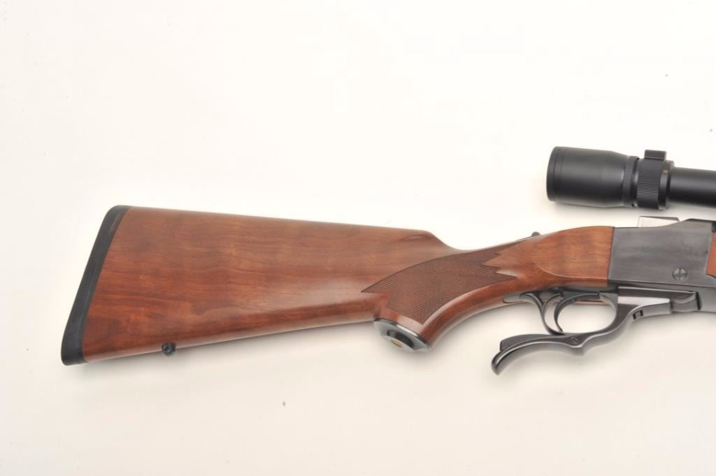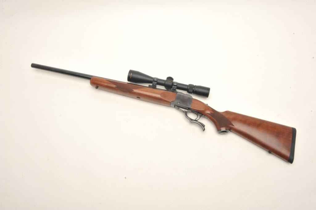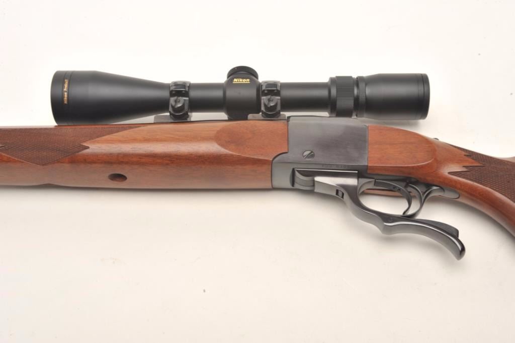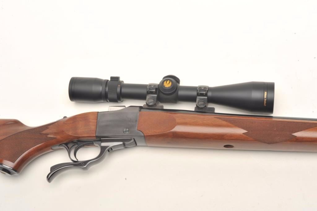Ruger No. 1 single shot rifle, #133-61068. 24" heavy Bbl, .22-250 cal., checkered walnut stock, mounted with Nikon Prostaff 3x9 scope. Rifle is in fine to excellent condition. Est. $400-800. (Modern)