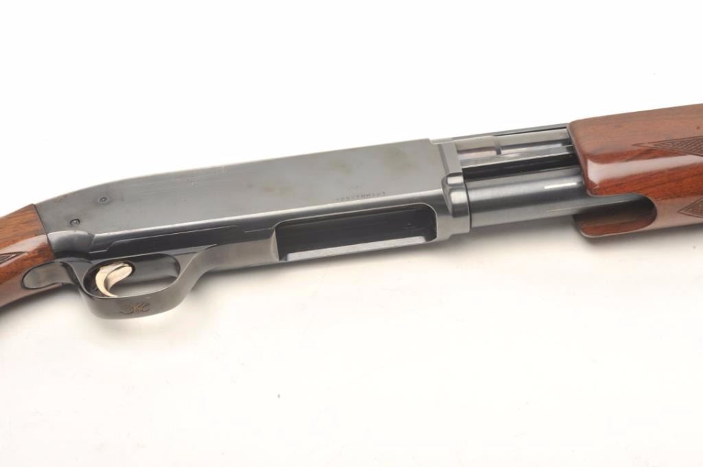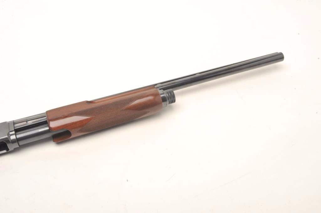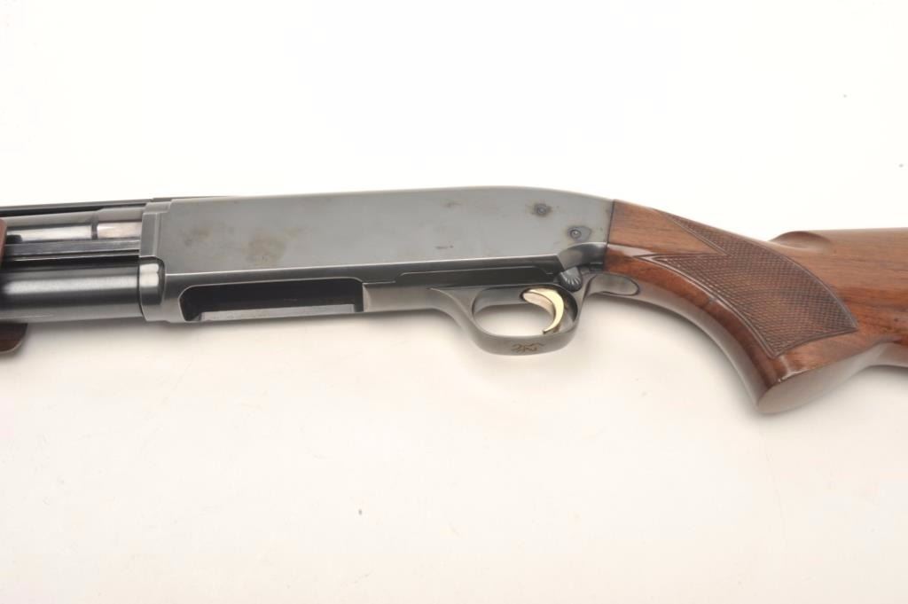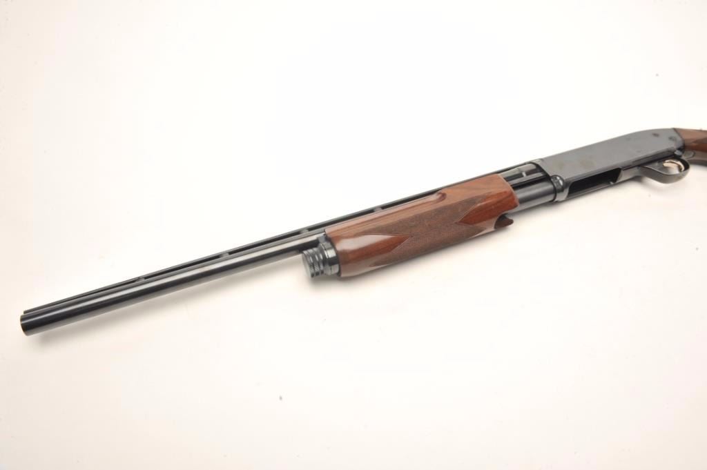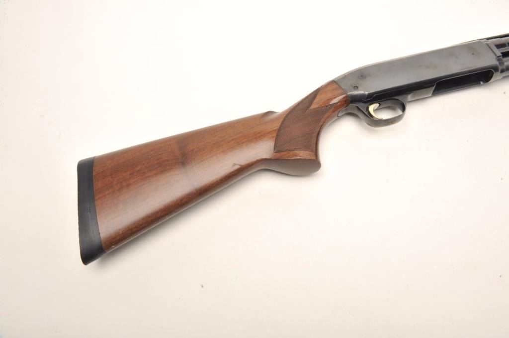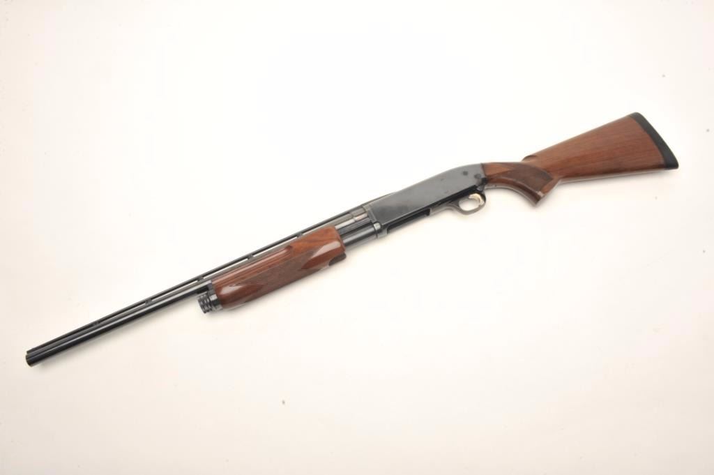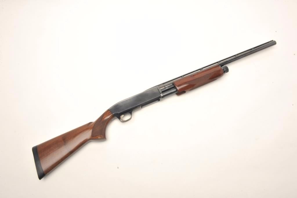 Browning BPS pump shotgun, #3297YMM121. 20 Gauge, 22" high-ribbed Bbl., with screw-in chokes; shotgun is in fine to excellent used condition. Finish is 90-95% with some thinning on the right side of the receiverwhere some aggressive cleaning was done. Est. $300-600. (Modern)