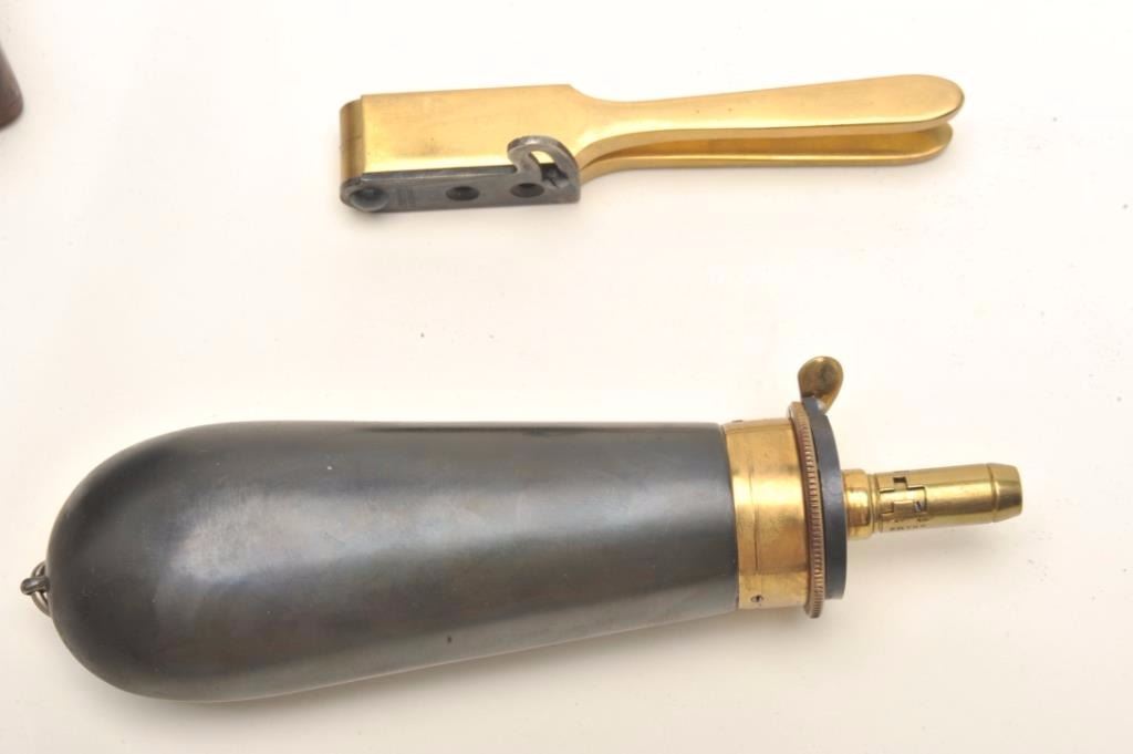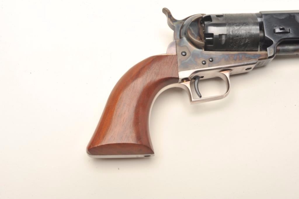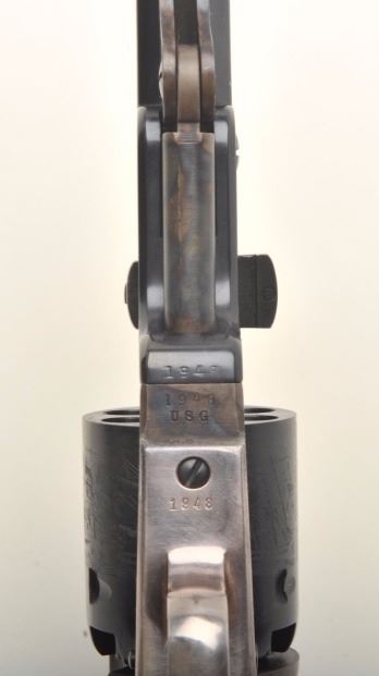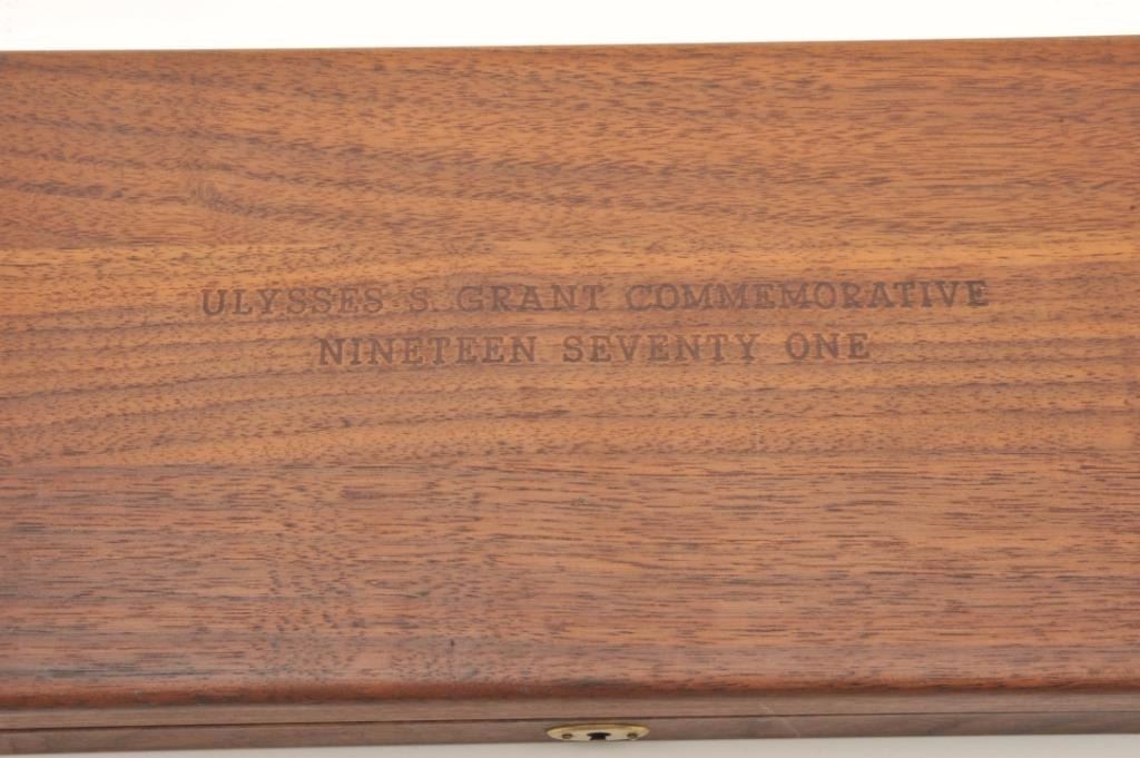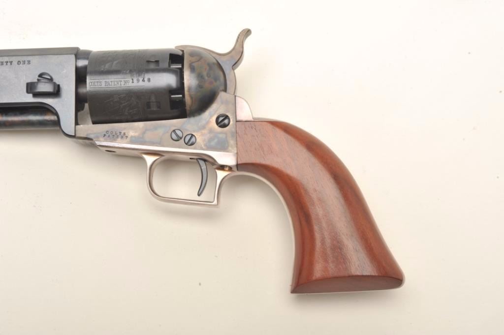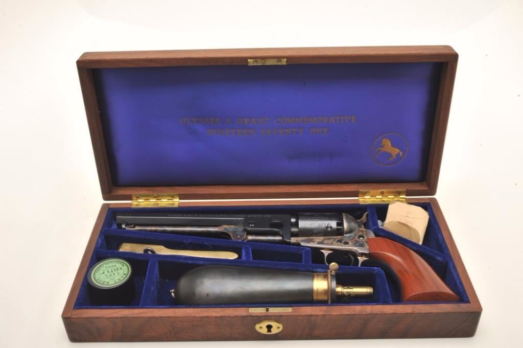 Colt Blackpowder Series U.S. Grant Commemorative (1971)Squareback Navy percussion revolver, .36 caliber, 7.5” octagon barrel, blued and case hardened finish, silver washed straps, wood grips, S/N 1948USG, in overall like new condition showing little handling, contained in a Colt factory presentation wood casing with accessories. (Percussion). Est.: $600-$1,000.