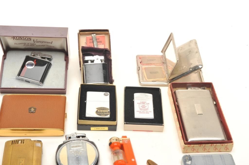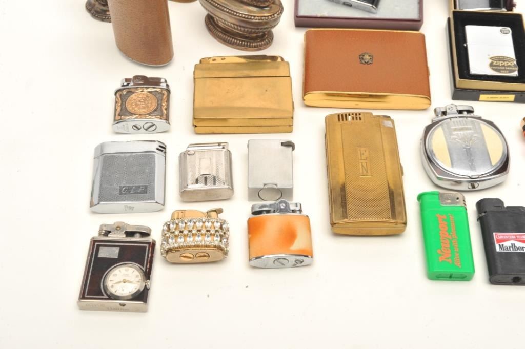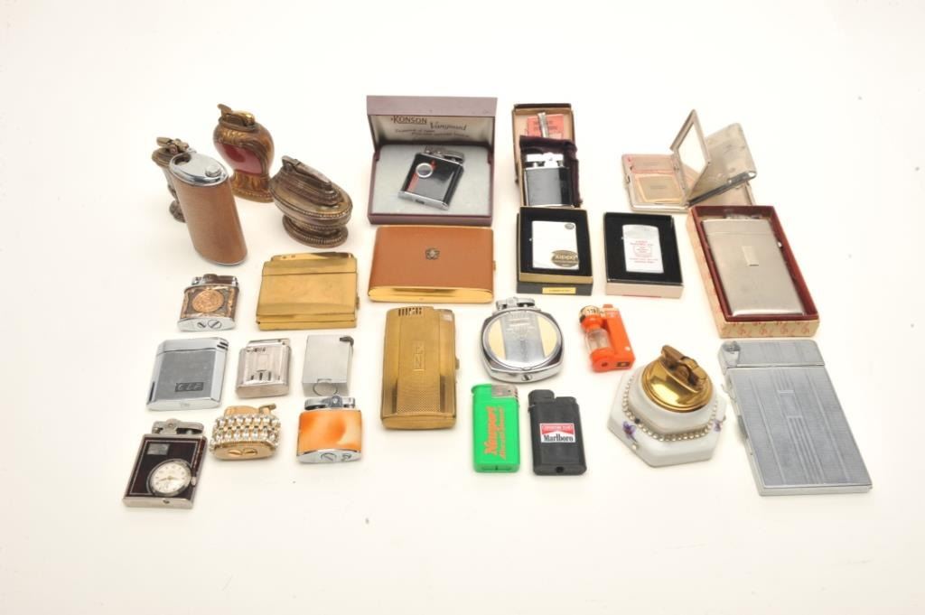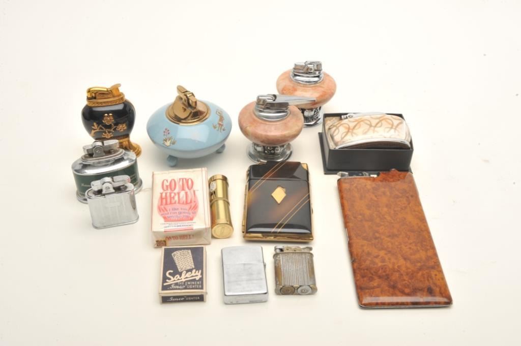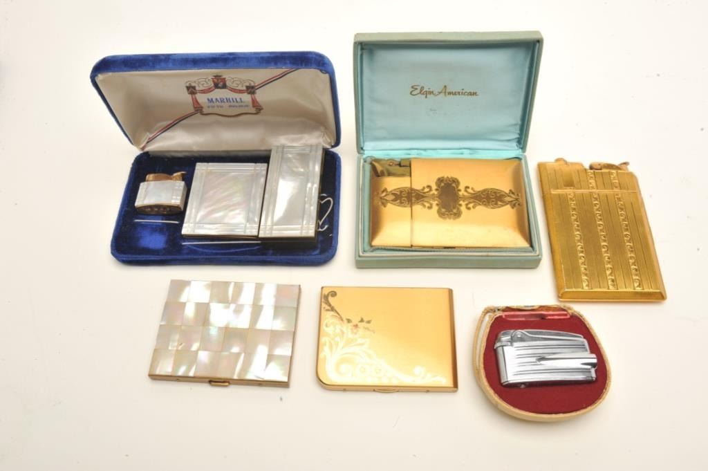 Bonanza lot of vintage pocket and desktop lighters but various makers like Ronson, Elgin American, etc.; also several fancy cigarette cases; a pearl set of lighter, cigarette case and mirror compact in aMarhill/Fifth Avenue casing; also several combination lighters/cigarette cases; some advertiser lighters and some with their original cardboard boxes. (Reference: James Flanagan’s definitive work “The BigBook of Cigarette Lighters”). Est.: $200-$350.