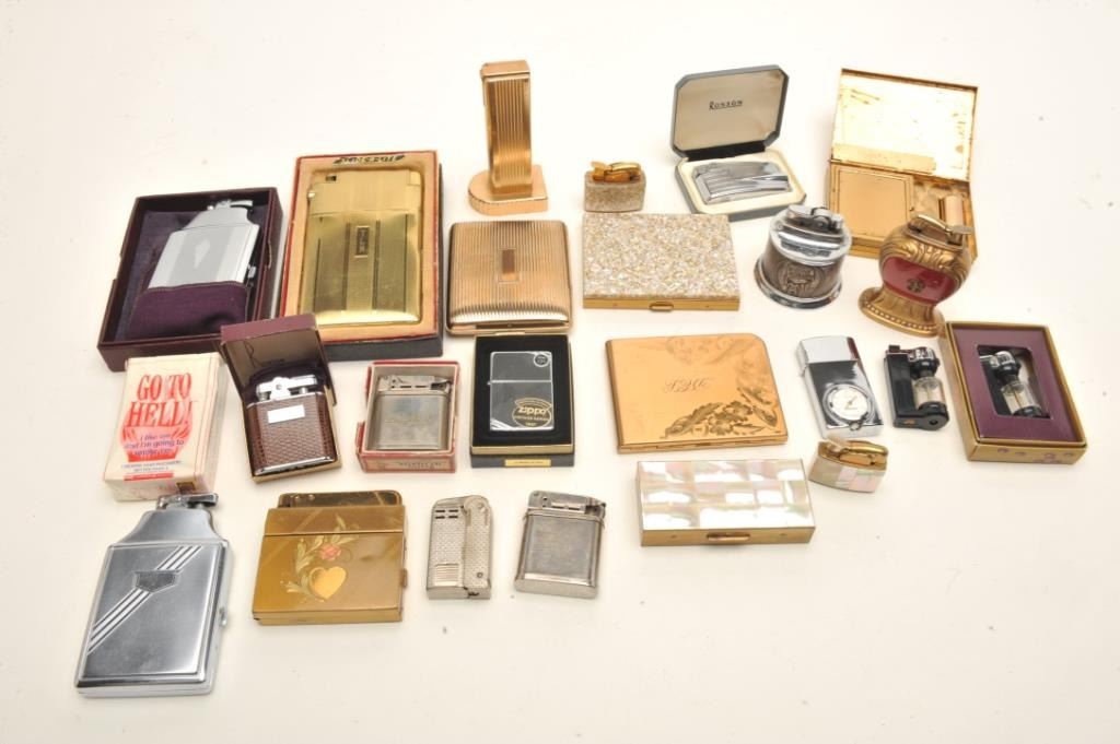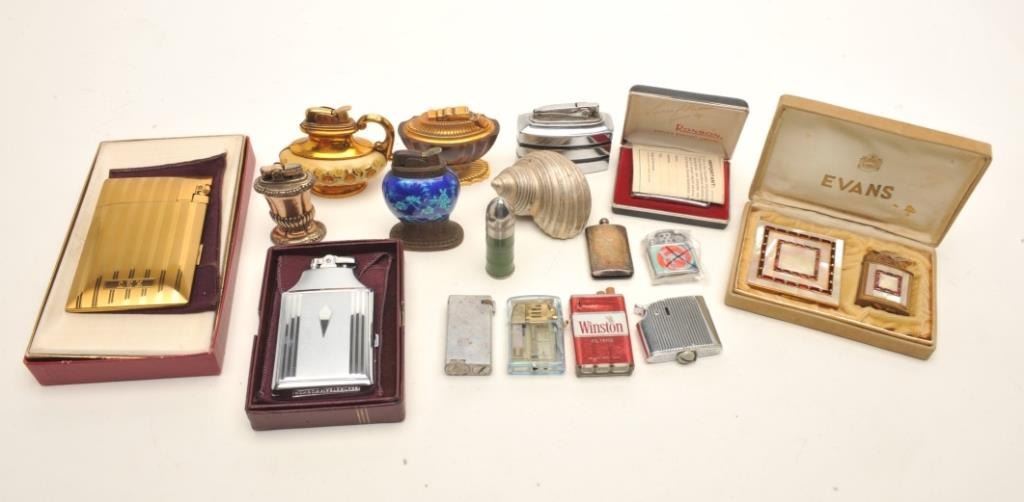 Lot of misc. vintage smoking accessories including pocket and desktop lighters, some with advertising; makers include Ronson, Zippo, Beattie and Evans; fancy cigarette cases and combination lighter/cases, somewith their original cardboard boxes; an Evans pearl and red stone set of a pocket lighter and a mirror compact in original Evans casing; fancy initialized cigarette cases, etc. (Reference: James Flanagan’sdefinitive work “The Big Book of Cigarette Lighters”). Est.: $200-$350.
