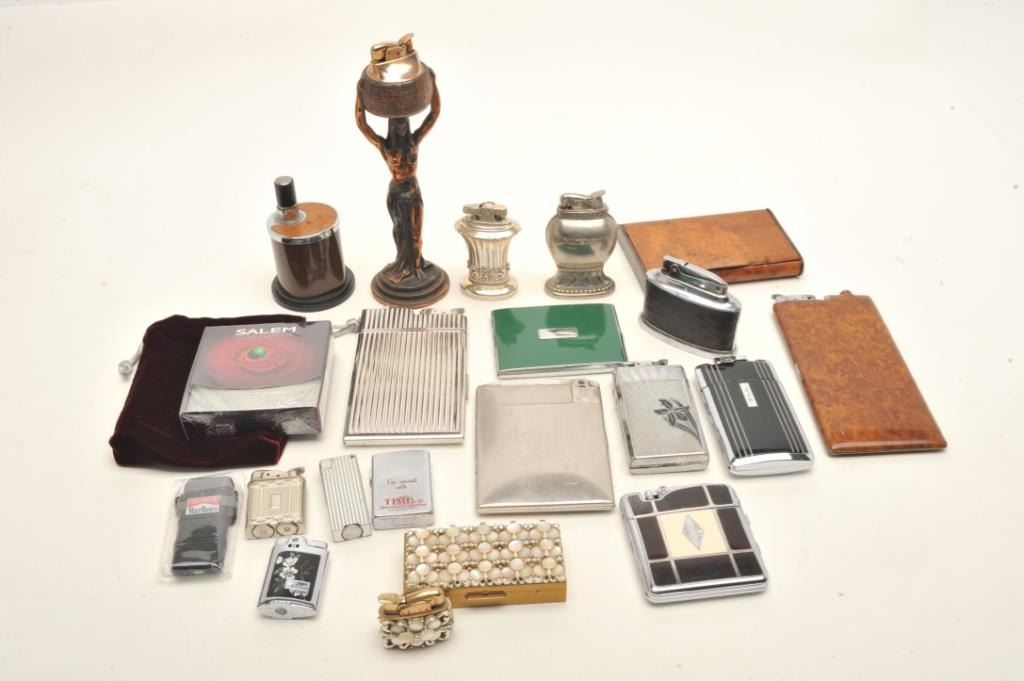 Lot 1121 Lot of misc. vintage smoking accessories including pocket and desktop lighters, some with advertis