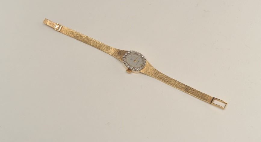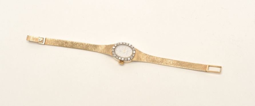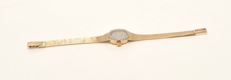 Lot 1133 Diminitive Ladies or Girl's 14K Gold Watch with Diamonds, Quartz movement needs battery. Maurice L