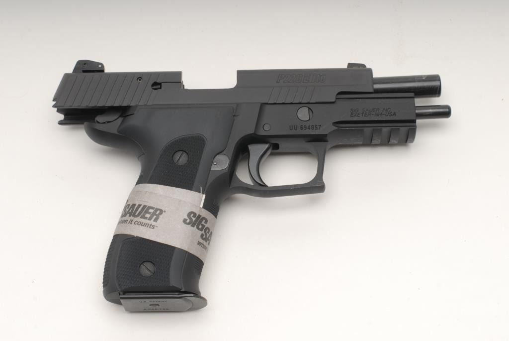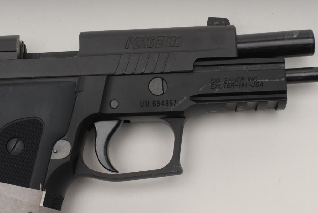 Sig Sauer P226 Dark Elite Semi-Auto pistol, 9mm, 4 ¼” barrel, black finish, adjustable night sights, accessory rail, S/N UU694857. This pistol remains in like new condition showing little handling and no use. Originalbox, manual and extra 10 round mag included. (No CA Sale) Est.: $700-$1400