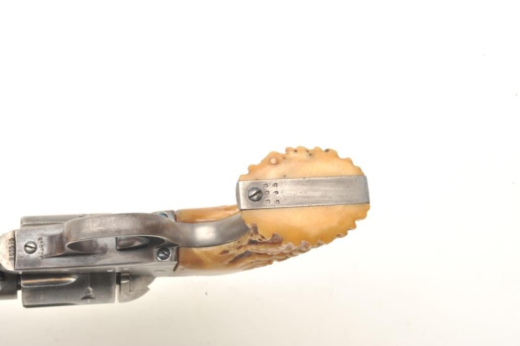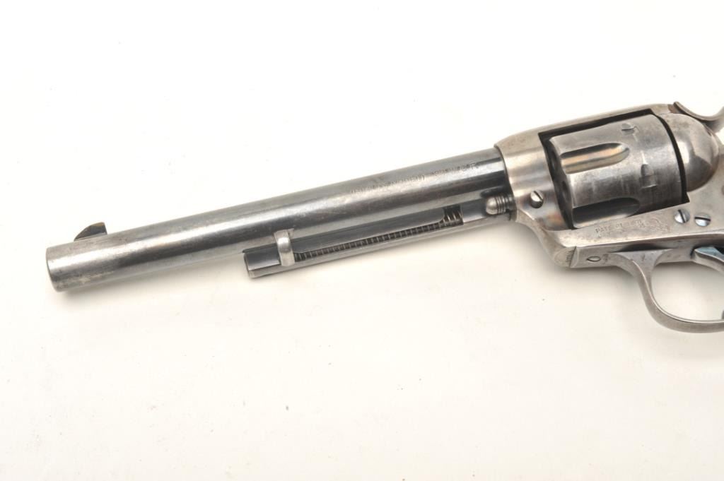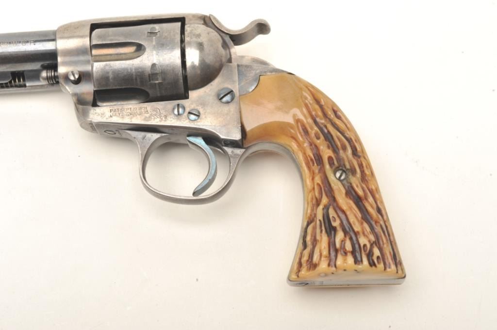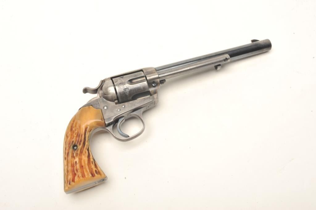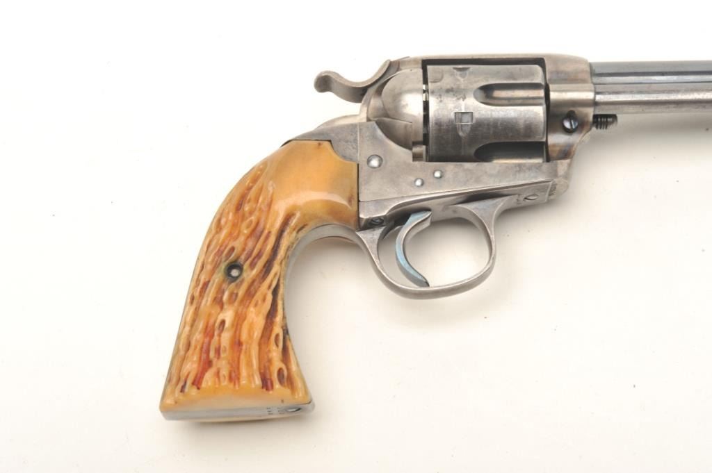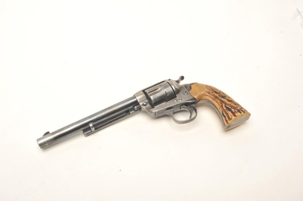 Colt Bisley 7 ½” Single Action Revolver in .32-20 caliber remaining in very good plus condition, S/N 303595. This revolver shows 50%-70% original thinning and toning case hardening and blue along with crisp markings. The front sight has been slimmed or reduced. Great period stag grips, good action and bright bore. Very pleasing and all matching. (C&R/PPT) Est.: $1500-$3000