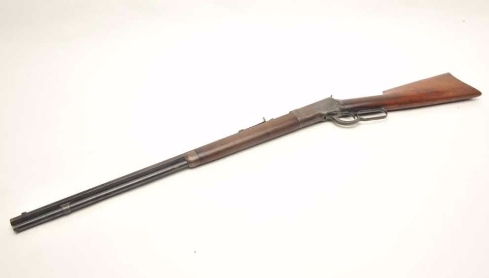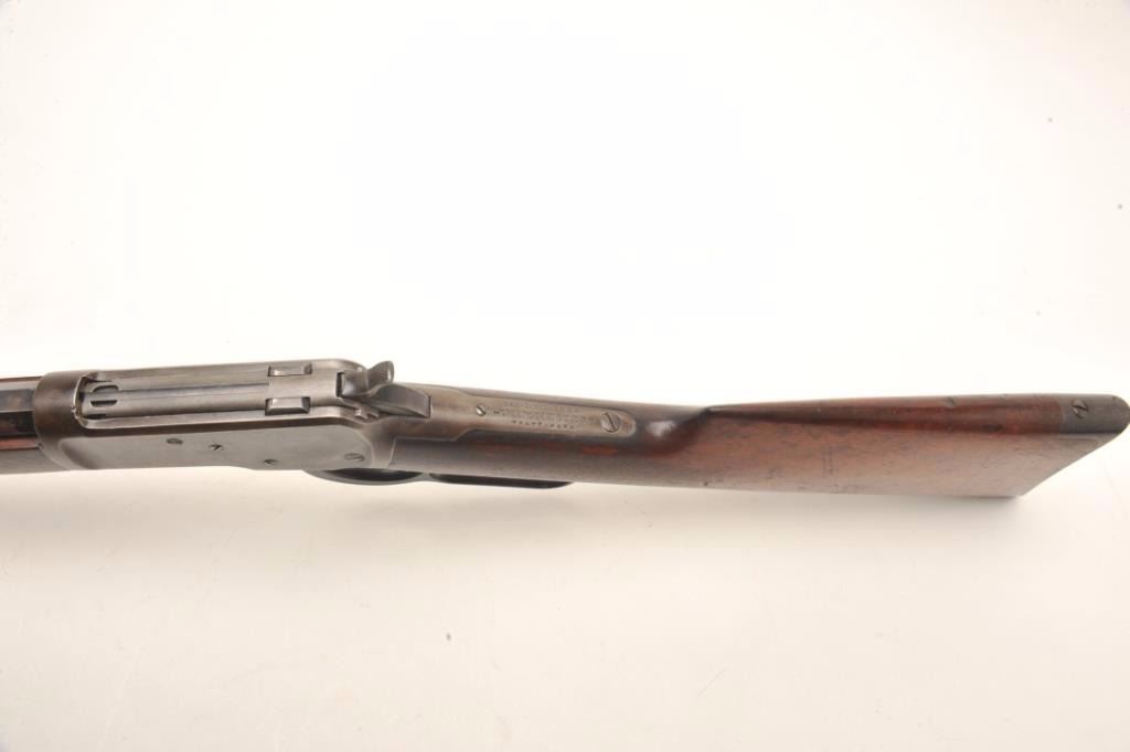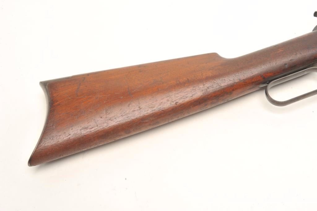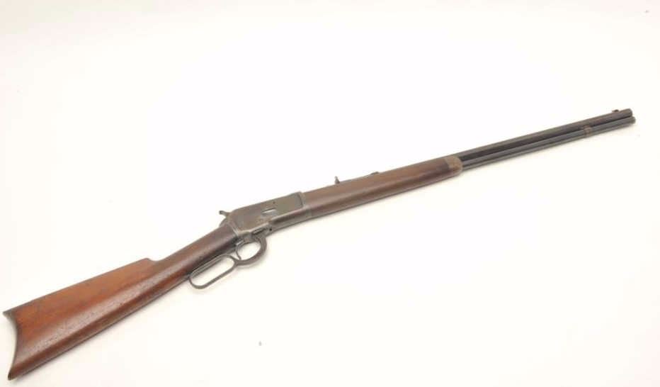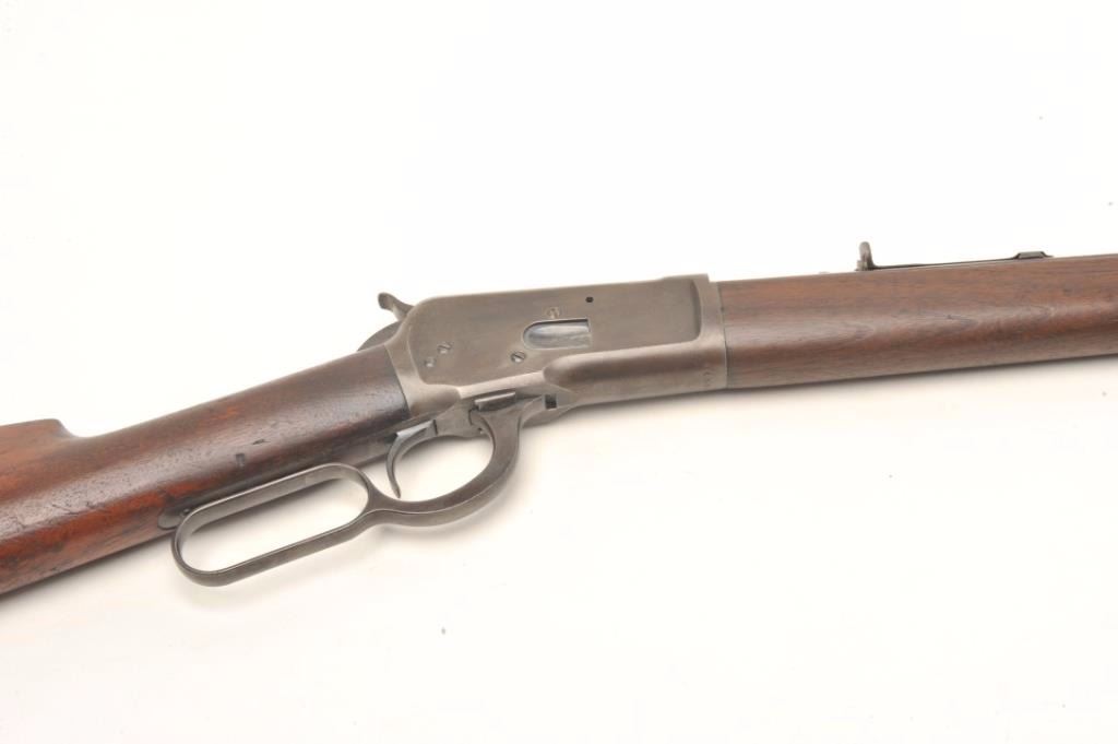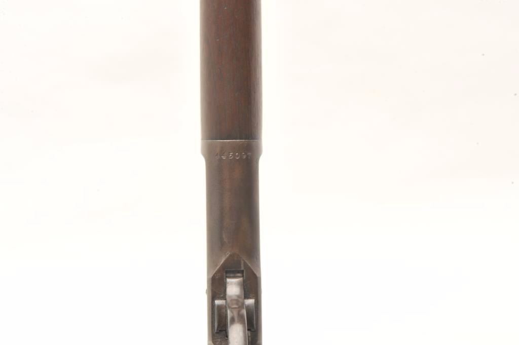 Winchester 1892 rifle in .32-20 with a 24” octagon barrel, full mag, crescent butt, S/N 445097. This rifle remains in good original condition showing 30%-50% blue turning plum with good to very good wood showing slightimperfections. Good markings. The bore is a little rough but may clean. (C&R) Est.: $600-$1200