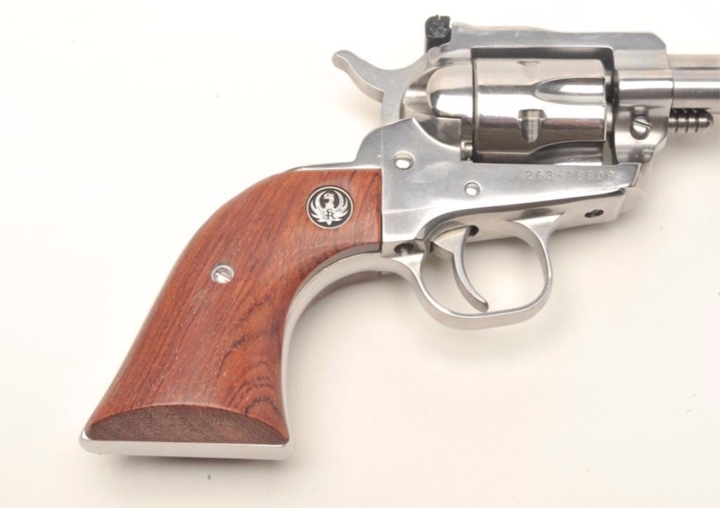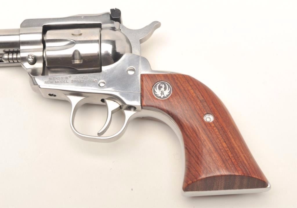 Ruger New Model Single-six, #26328809, with extra .22 Magnum cylinder, 5.5" Bbl, polished stainless finish, smooth logo rosewood grips, adjustable sights. Gun is in excellent condition, showing little use. Includesoriginal case and paperwork. Est. $250-500. (Modern, PPT)