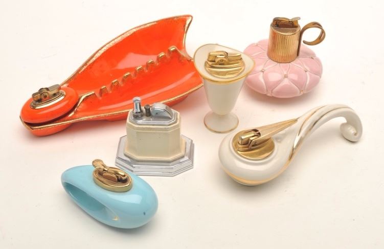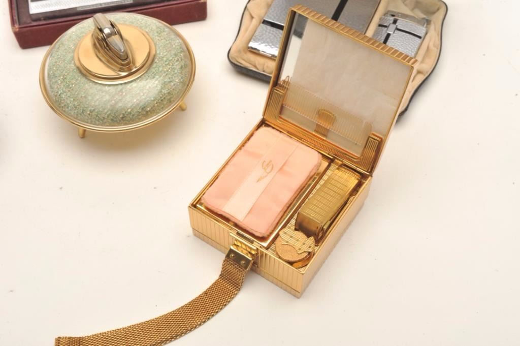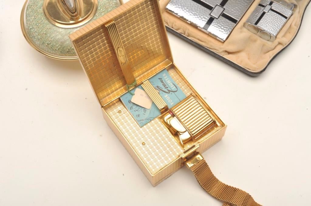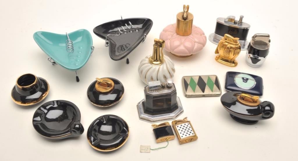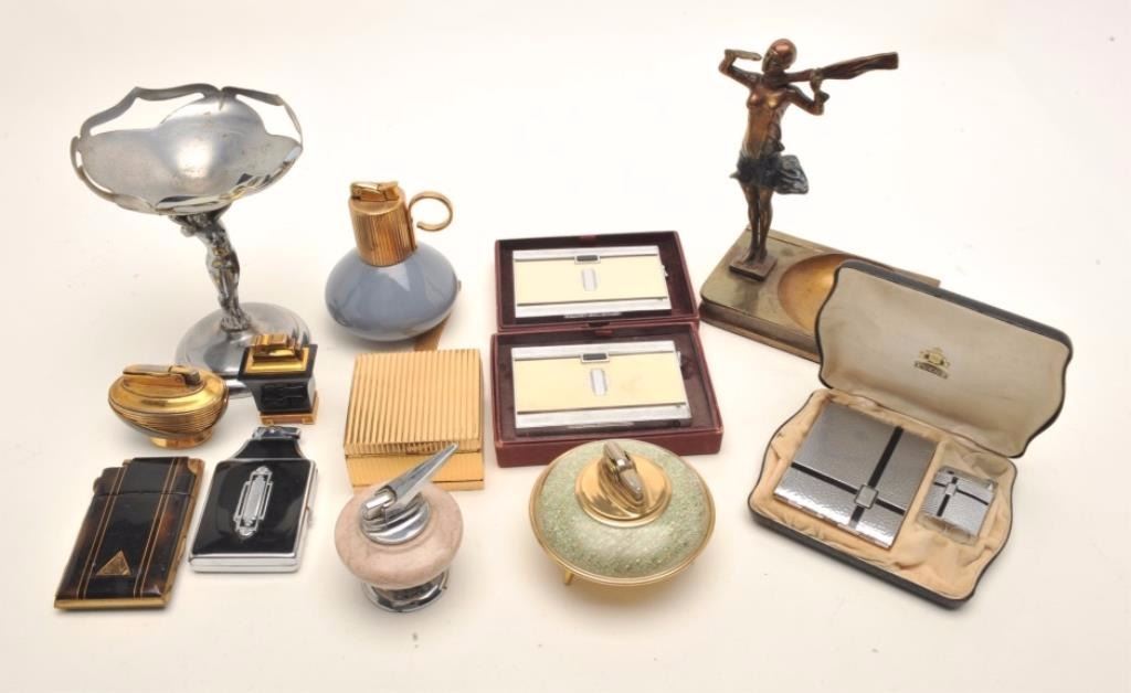 Bonanza lot of primarily Art Deco style vintage smoking and tobacco accessories including lighters, decorative ashtrays, etc. by makers Ronson and Evans including a beautiful Evans ladies gold colored metaltote box with strap and made two sided; one side for compact, accessories & mirror; the other side for cigarettes and a small lighter (all in factory cardboard box); also an Art Deco ashtray with standing gilded lady“flapper”; a lifetime collection of this well-regarded period in American art history. (Reference: James Flanagan’s definitive work “The Big Book of Cigarette Lighters”). Est.: $350-$500