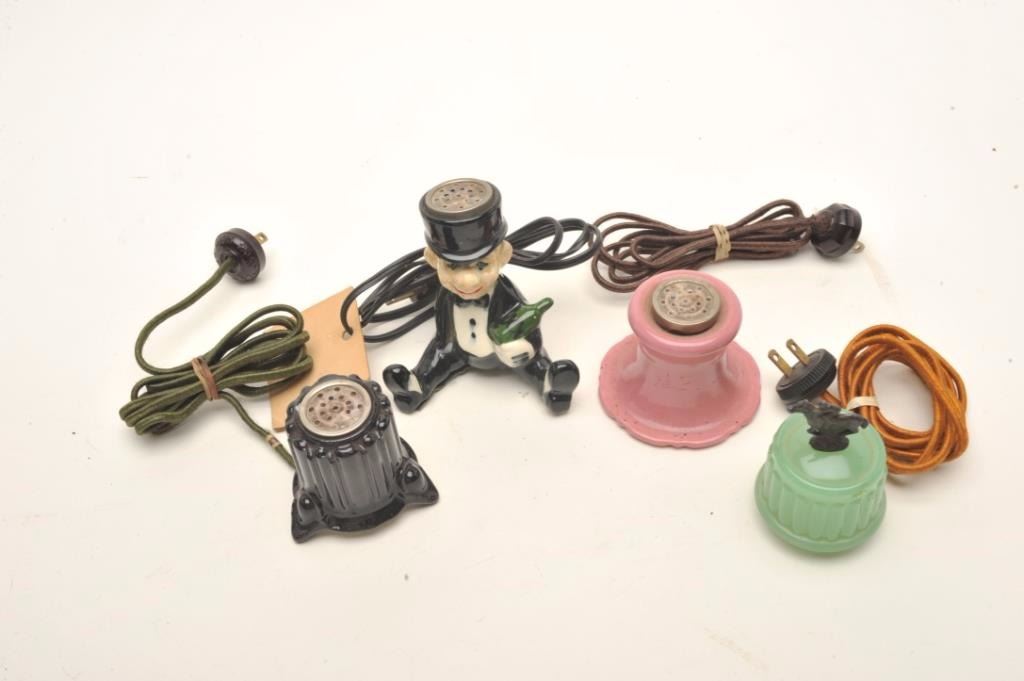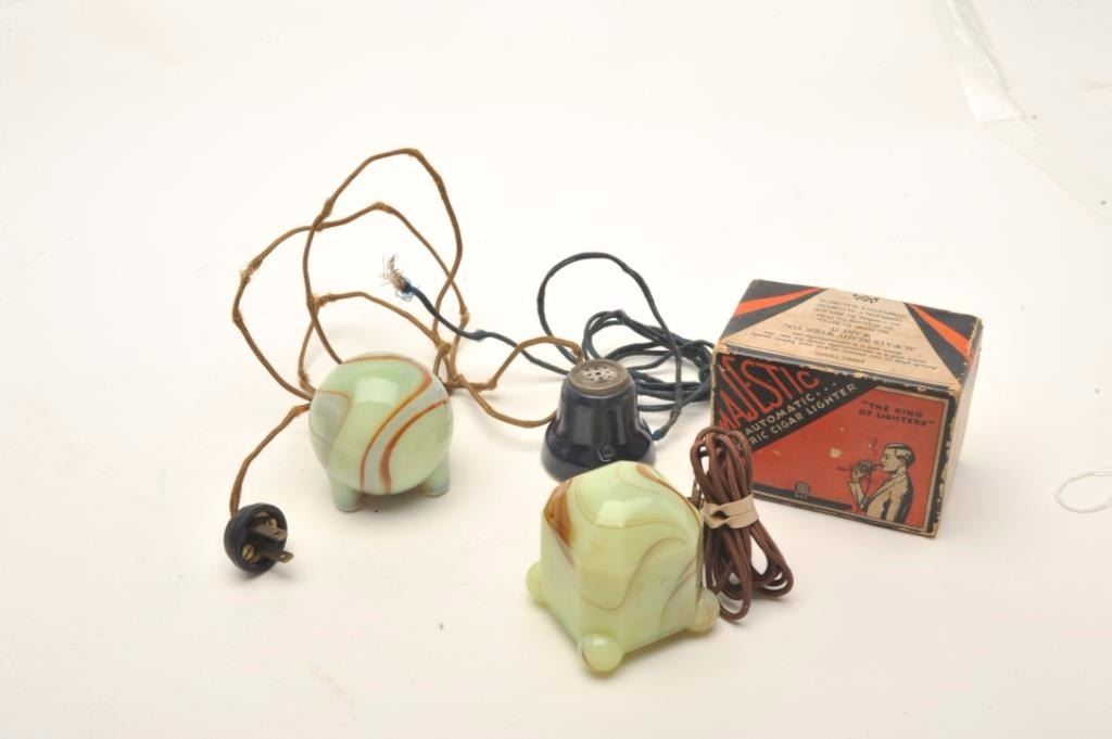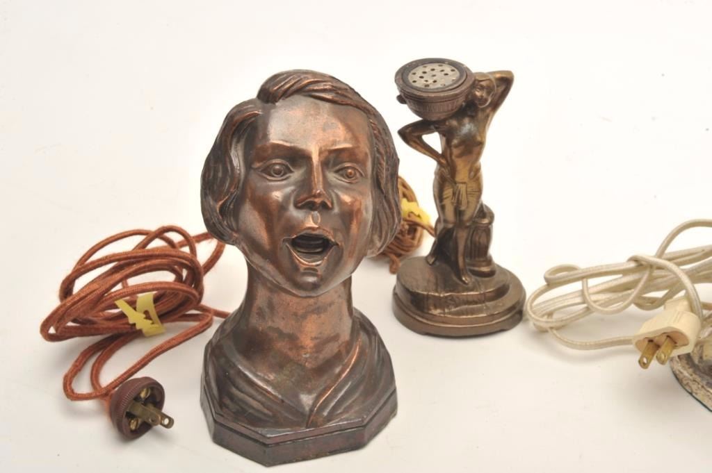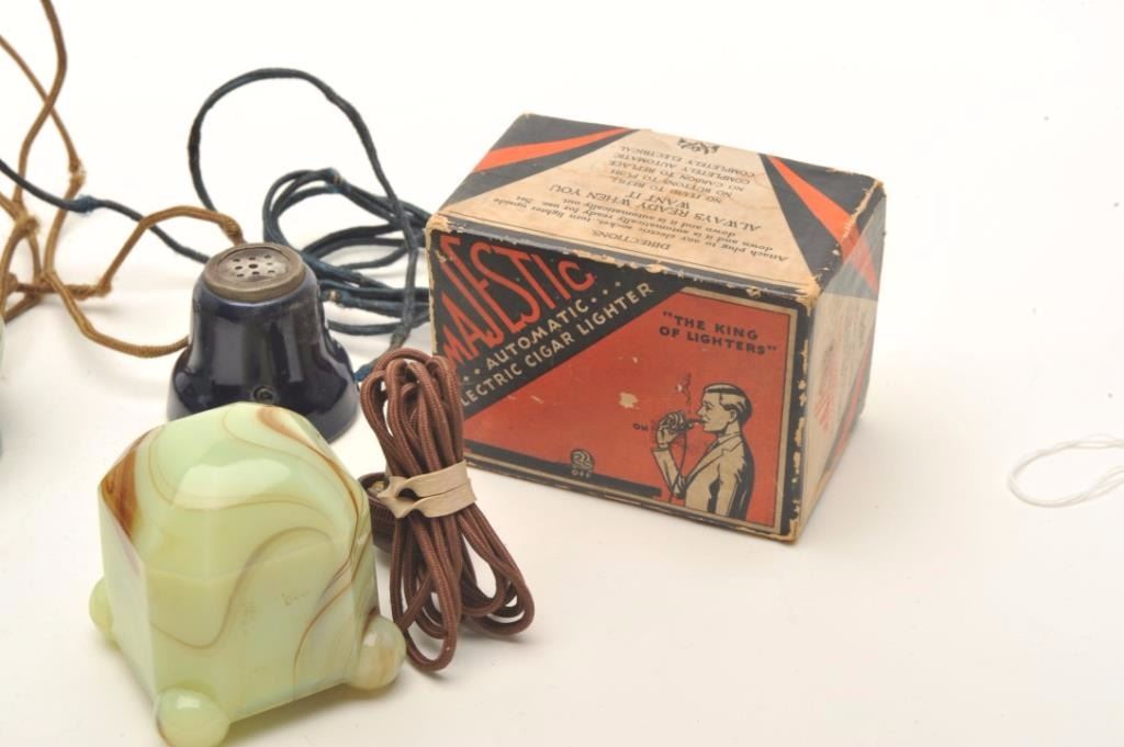 Lot of vintage and collectible electric table cigarette/cigar lighters including 3 table lighters of a woman’s head with the heating element in the mouth (ca. 1920’s); a Majestic electric cigar lighter in original factorycardboard box; a nude electric brass table lighter (ca. 1925); plus a variety of other electric lighters, some in stone, some molded, one ceramic. (Reference: James Flanagan’s definitive work “The Big Book ofCigarette Lighters”). Est.: $550-$800.