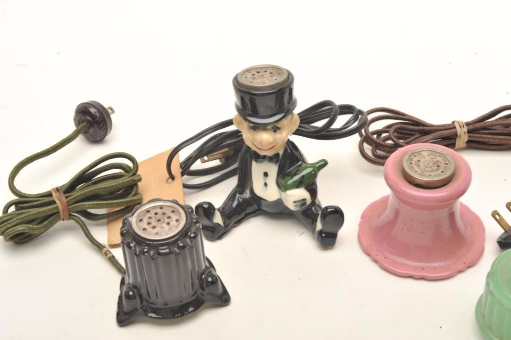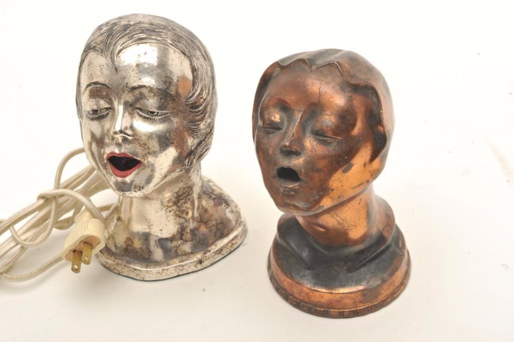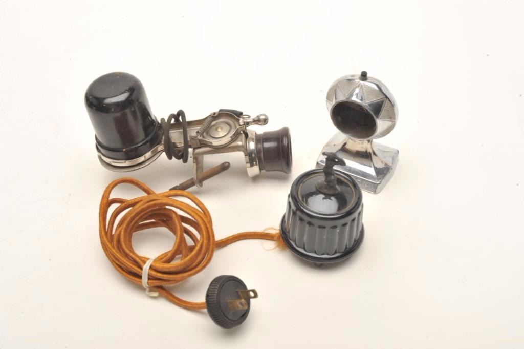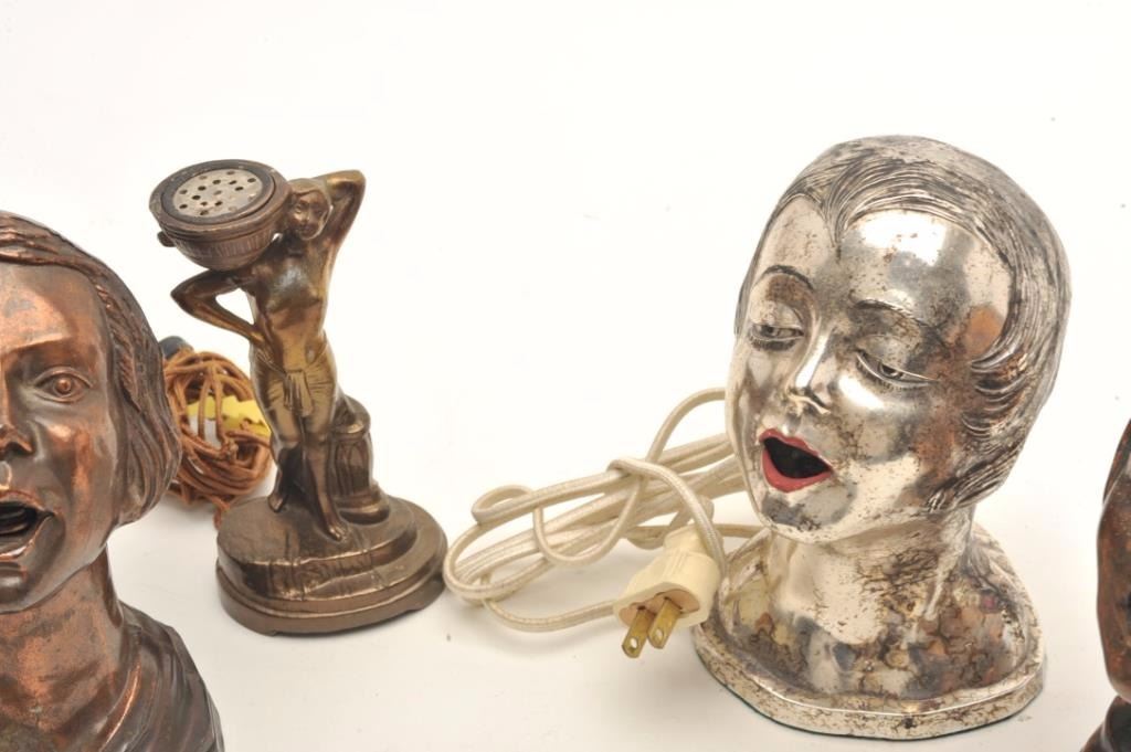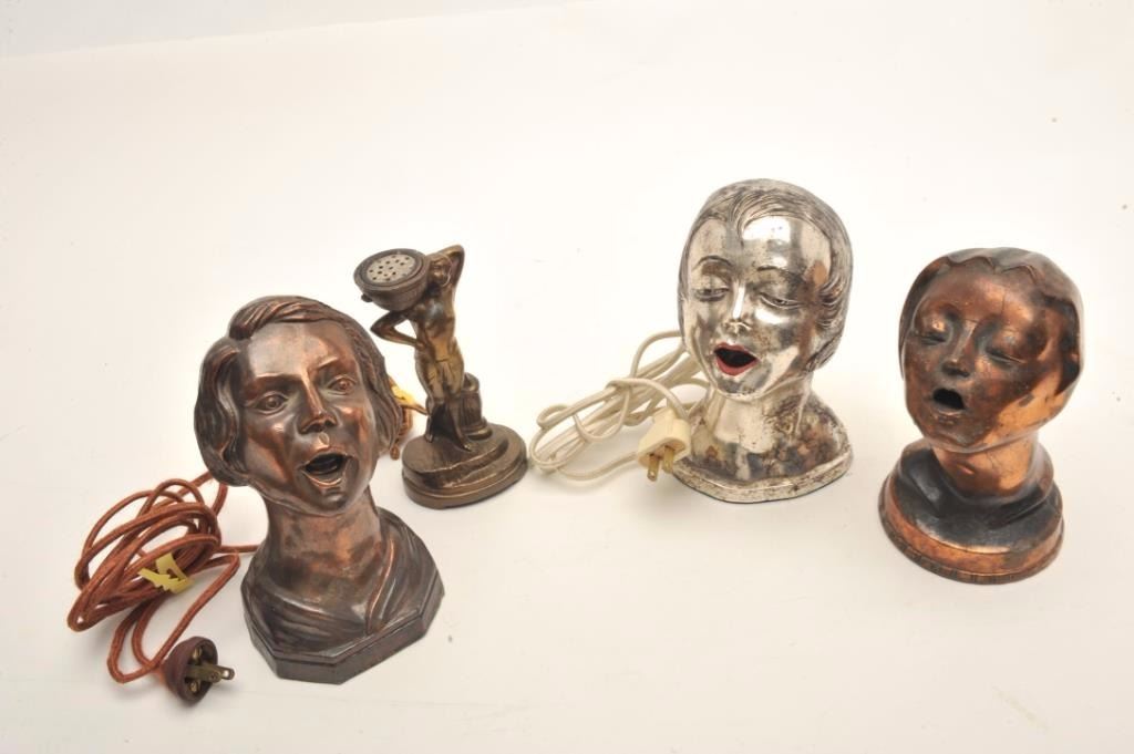 Lot of vintage and collectible electric table cigarette/cigar lighters including 3 table lighters of a woman’s head with the heating element in the mouth (ca. 1920’s); a Majestic electric cigar lighter in original factorycardboard box; a nude electric brass table lighter (ca. 1925); plus a variety of other electric lighters, some in stone, some molded, one ceramic. (Reference: James Flanagan’s definitive work “The Big Book ofCigarette Lighters”). Est.: $550-$800.