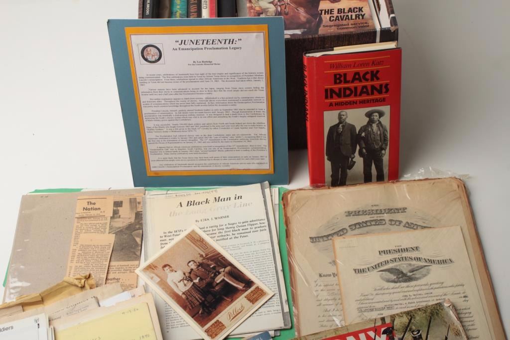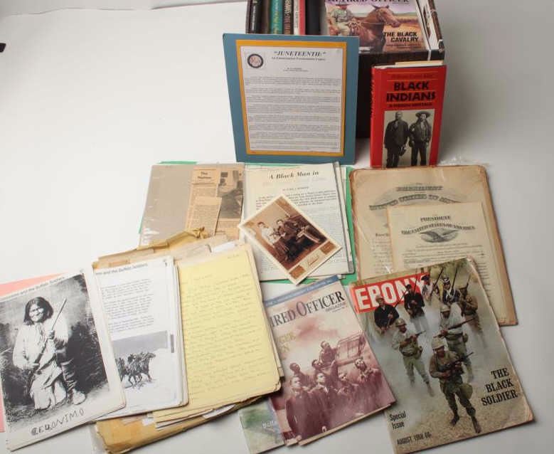 Black Soldier lot including framed color print of Black Cavalry members on horseback and a box of approximately 14 books, mostly on Black soldiers and units from various wars from the American Revolution to the WorldWars; misc. magazines, a file of newspaper articles, etc. Est.: $200-$400.