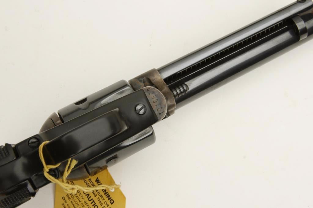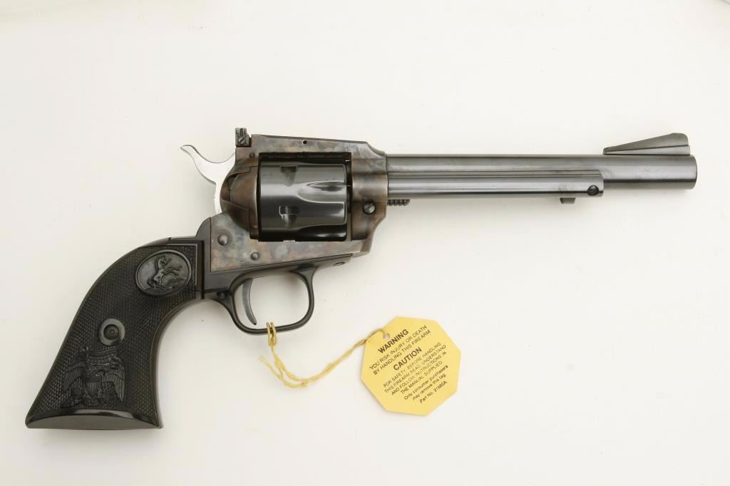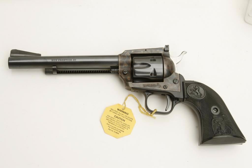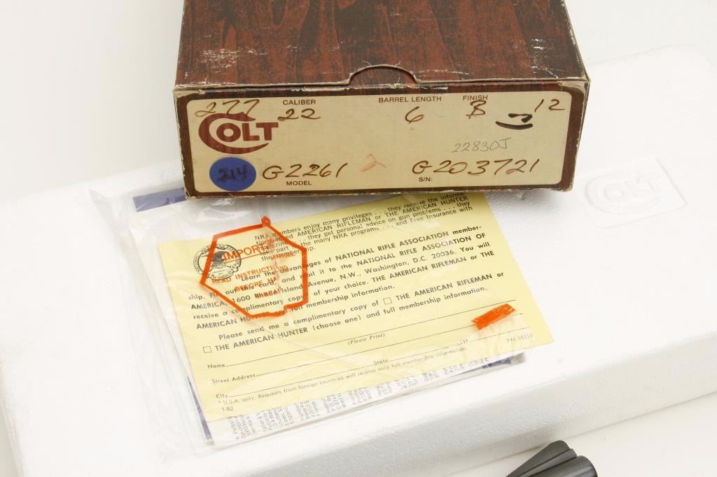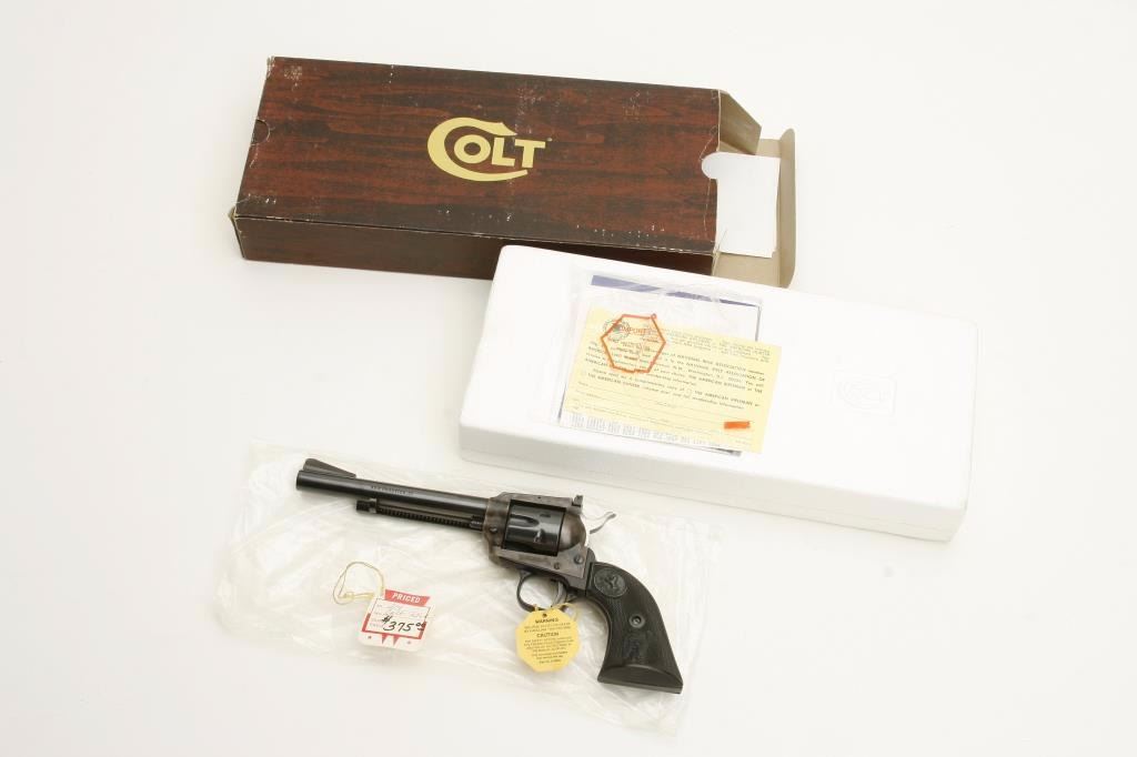 Colt New Frontier Model single action revolver, .22 caliber, 6” barrel, blued and case hardened finish, checkered eagle plastic grips, S/N G203721, in like new condition in factory wood grain cardboard box, insertsand instructions. Box is numbered to this gun. (Modern/PPT). Est.: $350-$700.