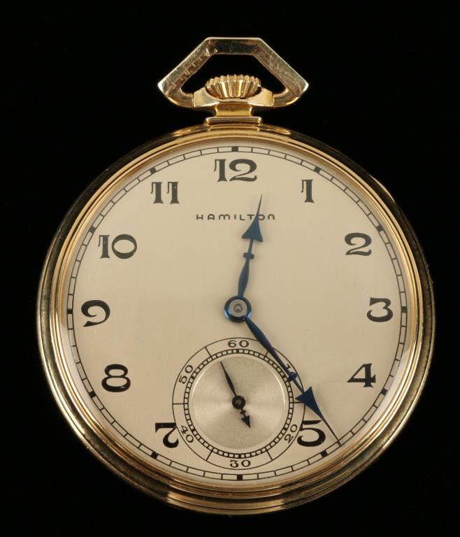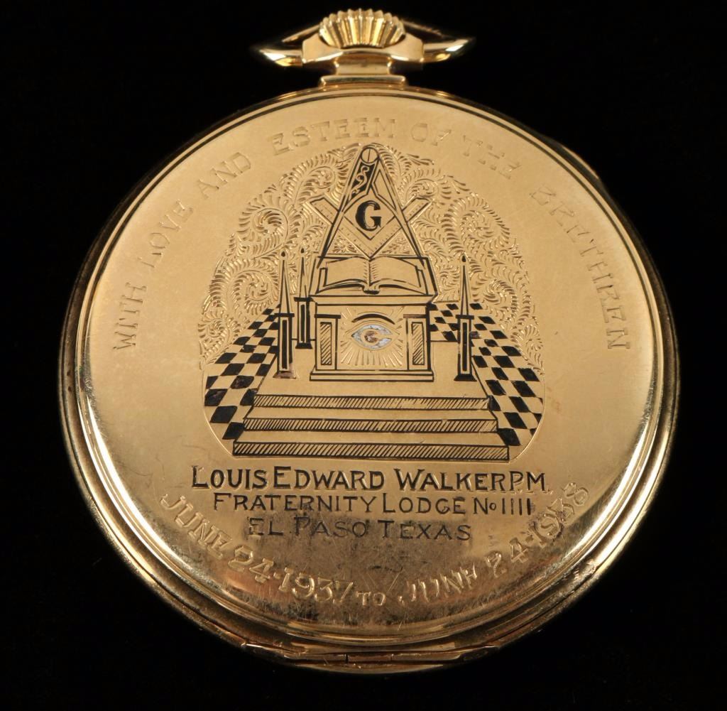 Hamilton open face pocket watch in Art Deco style, approximately 1.75” in diameter, running at time of description and in beautiful condition with Masonic inscription on the back cover: “WITH LOVE AND ESTEEM OFTHE BRETHREN; LOUIS EDWARDWALKER, P.M.; FRATERNITY LODGE NO. 1111, EL PASO, TEXAS; JUNE 24, 1937 TO JUNE 24, 1938”. Should be further researched. Est.: $150-$300.