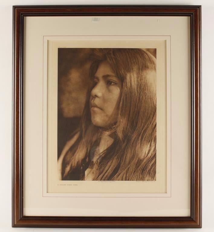 Nicely framed and matted sepia tone print by Curtis, entitled “A Coast Pomo Girl”; plate 486, marked from copyright photograph by Edward Curtis, 1924, photogravure media, Suffolk Eng. Co., Cambridge, Mass; 18” x14” image size only. Est.: $300-$600.