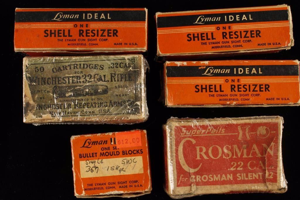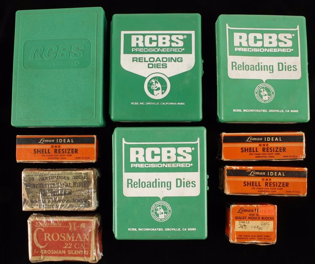Lot of reloading dies including .357 Mag., .41 Colt, .303 Sav. and .35 Rem; also 3 Lyman Ideal shell resizers, .35 Rem, .33 Win. and .43 Spanish; one .357 single cavity mold, a box of Crosman .22 pellets and a box ofWinchester .32 cal., cartridges for the 1873 Winchester rifle, both boxes are partials. Est.: $300-$600.