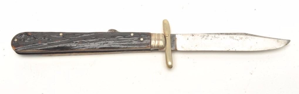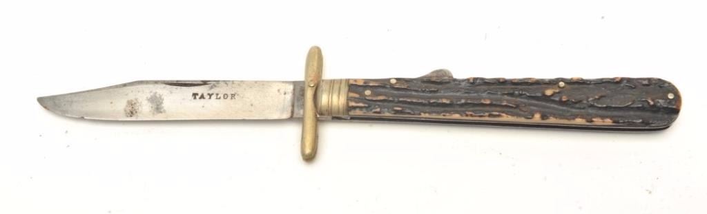 Taylor marked Sheffield lockblade folding knife from Sheffield circa 1850s to 70s. Measures 10” overall with a 4 ¼” blade. The blade has been reduced with some cleaning and sharpening. Est.: $600-$1200