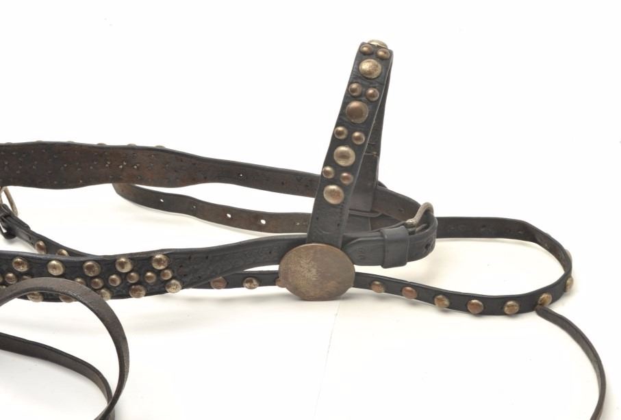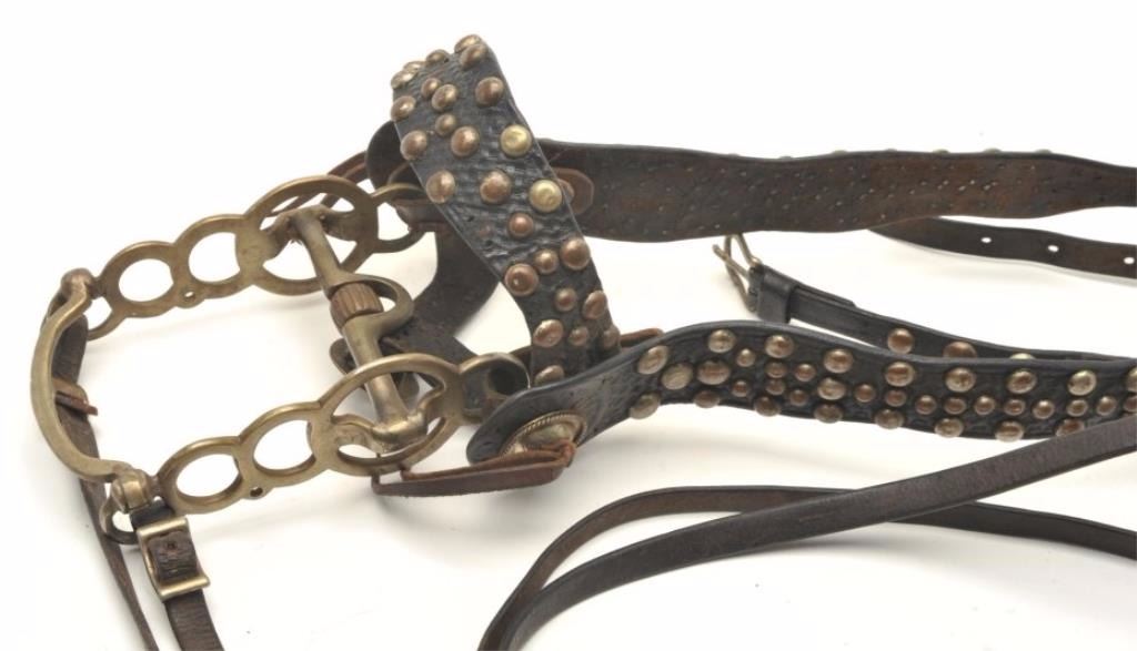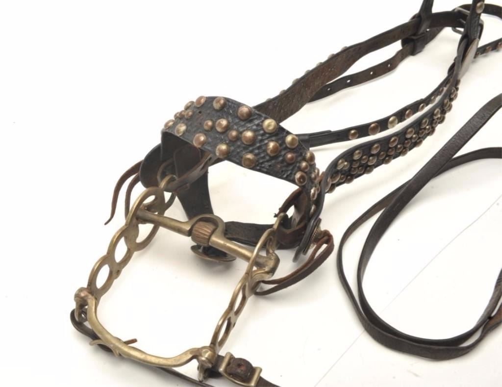 Lot 1227 Cowboy studded headstall with Visalia “Humane” polo style bit with conchos and decoration. Great d