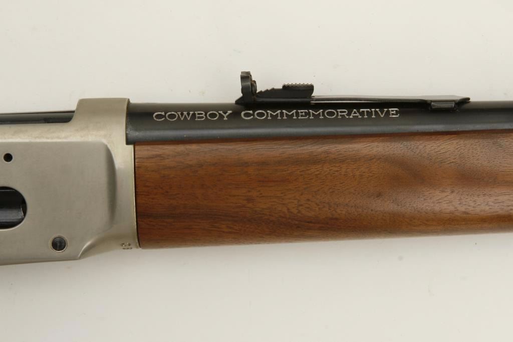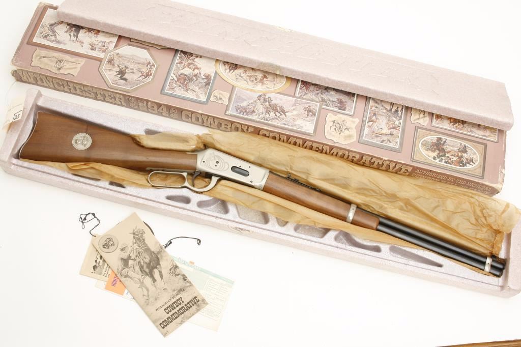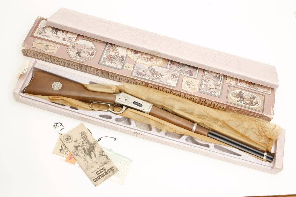 Winchester Model 94 Cowboy Commemorative lever action saddle ring carbine, 30-30 Win. Caliber, serial #CB23846. The carbine is as new in the box with a 20” round, blued barrel. The carbine features a blued barrelwith nickel barrel bands and receiver. The receiver is embossed with a cowboy figure, lariat and spurs. The carbine is new in the box with all associated paperwork, packing materials and cardboard sleeve. The buttstock has a nickel commemorative medallion inlaid into the right side and has a smooth, polished nickel butt plate. (Modern) Est.: $400-$800.