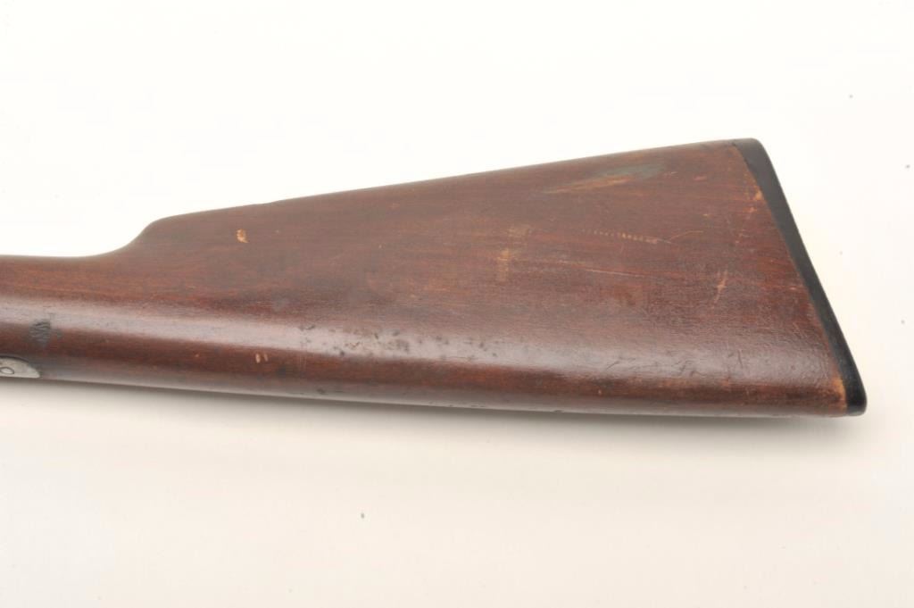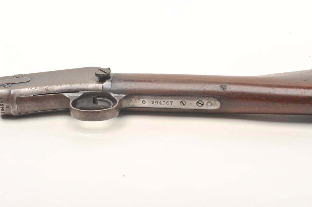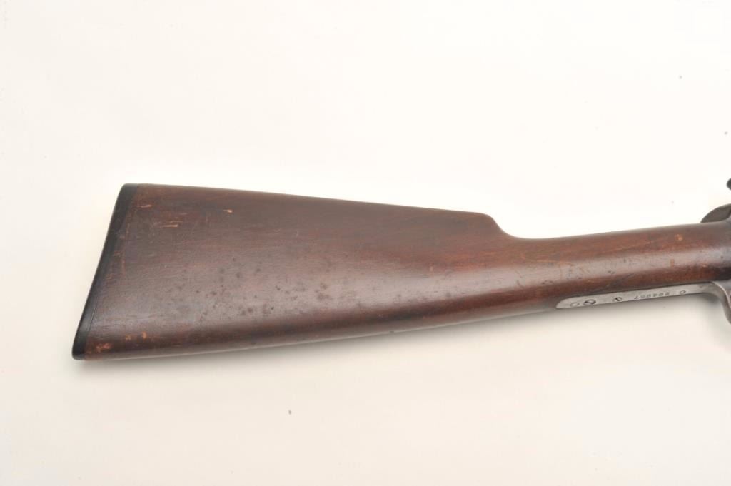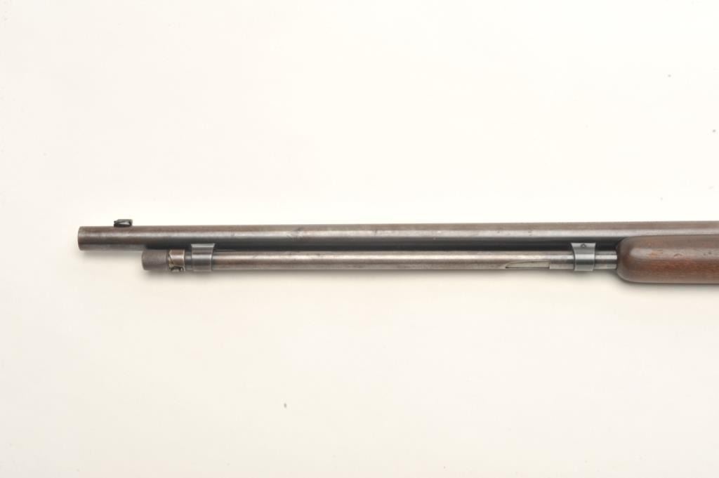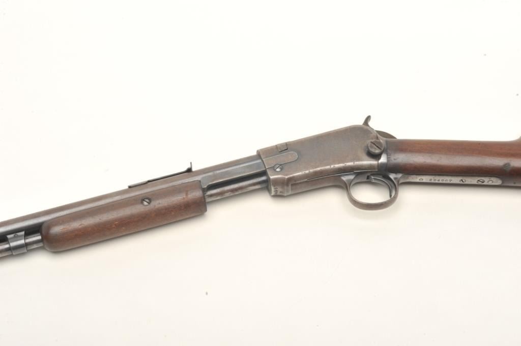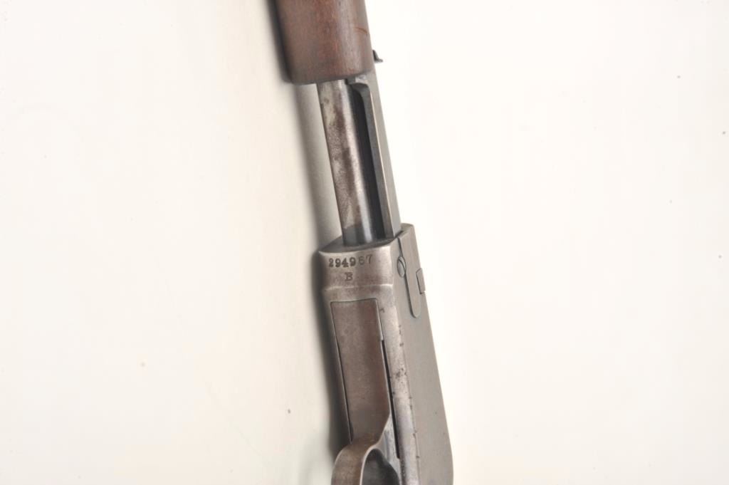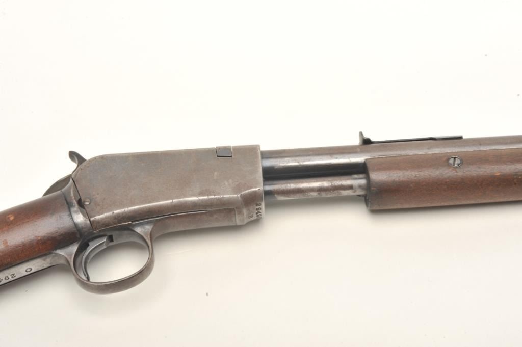 Winchester Model 1906 pump rifle, .22 Short-Long or Long Rifle caliber, serial #294967. The rifle is in good overall condition with a 20” round barrel with ramp front and standard rear sights. The barreland magazine retain a significant amount of thinning blue finish in protected areas with the remainder going to patina. The receiver shows significant flaking blue with the remainder going to plum patina. The smoothwood stocks are in good condition with small mars and compressions while the butt stock ends with a Winchester marked hard rubber butt plate. The bore is fair, the action crisp and markings are sharp on thisdesirable Winchester. Est.: $400-$600. (C+R).