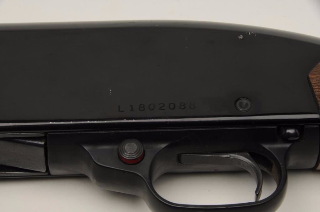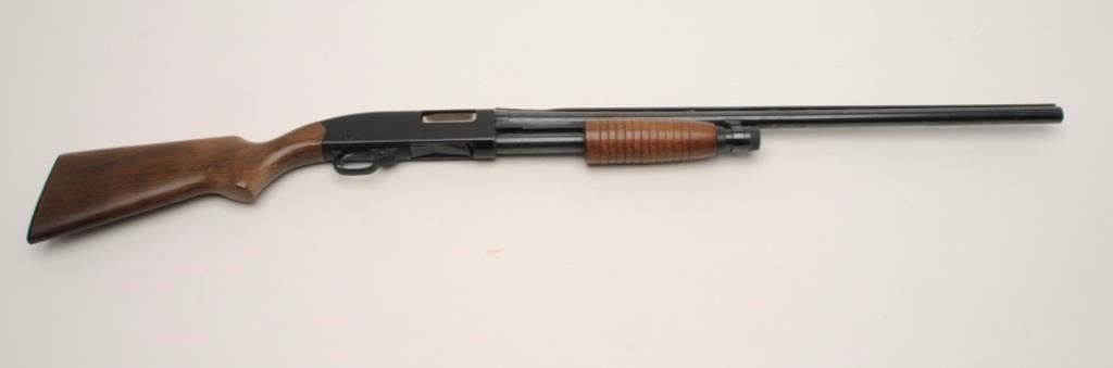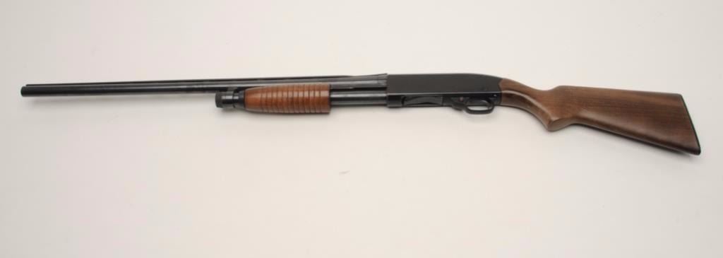 Winchester Ranger Model 120 pump shotgun, 12 gauge, serial #L1802088. The shotgun is in good overall condition with a 28” barrel with a full-length ventilated rib and steel bead front sight. The barrel and receiver retainthe majority of their blued finish with light surface rust and numerous scratches noted. The rib has come loose from the front ring and will require work. The smooth wood stocks are in good condition showingcompressions, scrapes and small mars from use. The butt ends with a hard plastic, Winchester marked butt plate and a 14” LOP. The bore is very good, the action crisp and markings are sharp. Est.: $175-$350.(Modern).