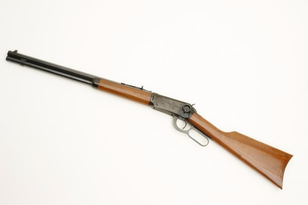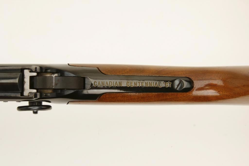 Winchester Canadian Centennial Model 94 lever action carbine, 30-30 caliber, serial #89795. The rifle is in very good overall condition with a 20” octagon barrel. The barrel is marked, “Canadian Centennial1867-1967”. The barrel and full-length magazine retain a significant amount of their original blued finish with slight wear at the muzzle. The receiver has engraving depicting maple leaves and retains themajority of its blued finish. The smooth wood stocks are in very good condition with small mars and handling marks. The butt stock ends with a smooth, metal crescent butt plate. The bore is good, the action sharpand markings are sharp. (Modern) Est.: $300-$600.