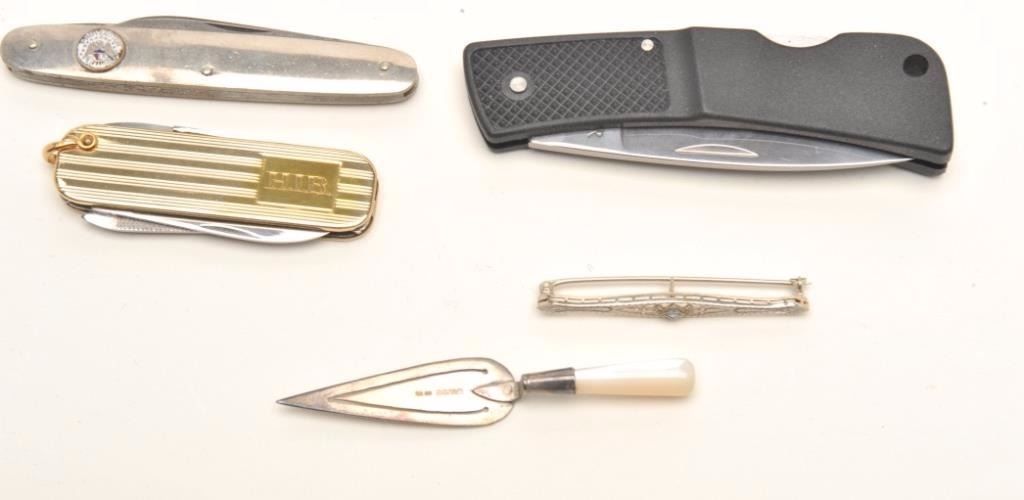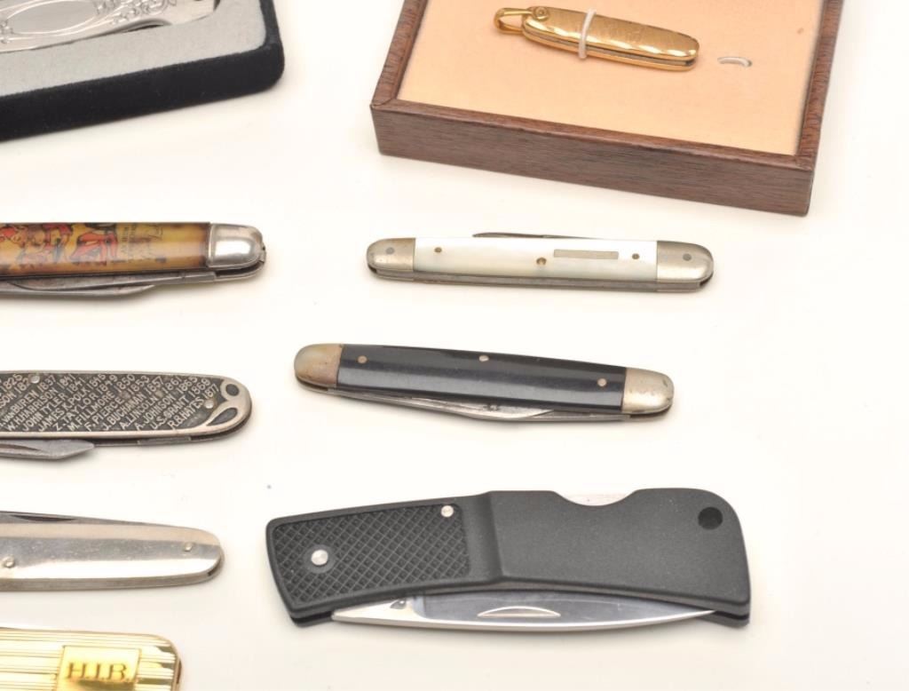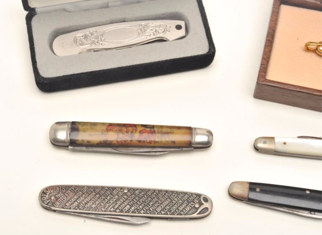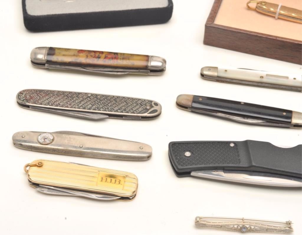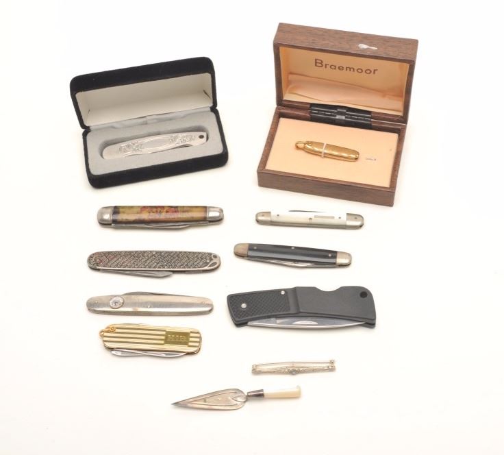 Lot of pocket knives, 1 Tiffany in blue bag, Braemoor, Gerber, and 4 misc. antiques. Est.: $300-$600