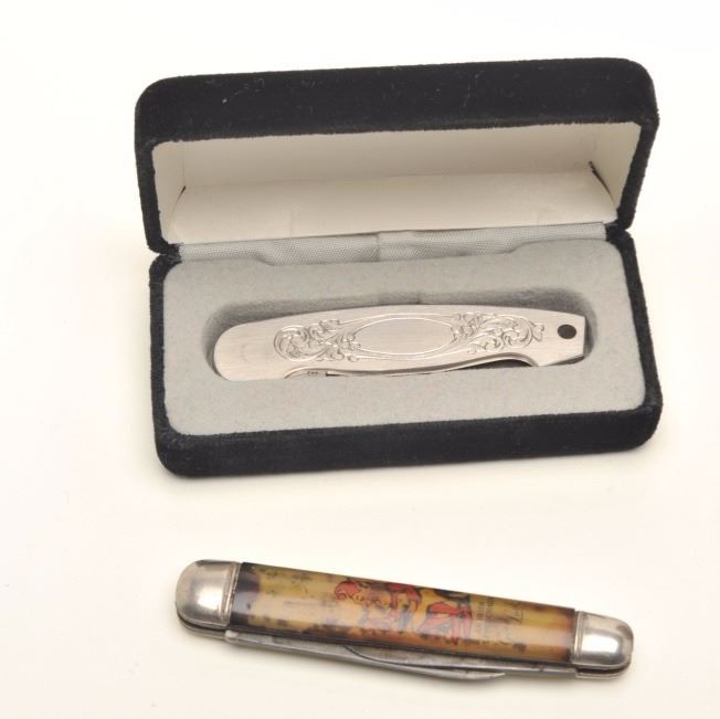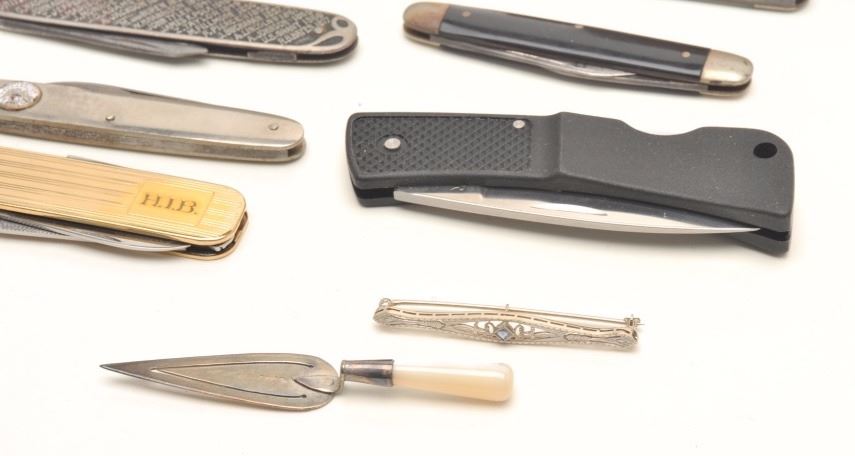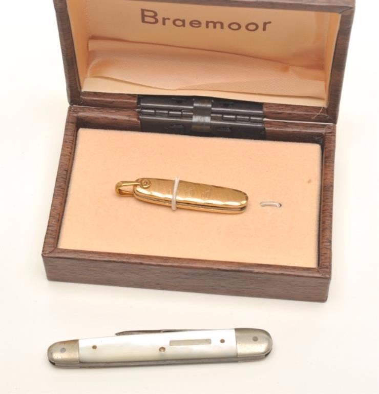 Lot 1296 Lot of pocket knives, 1 Tiffany in blue bag, Braemoor, Gerber, and 4 misc. antiques. Est.: $300-$6