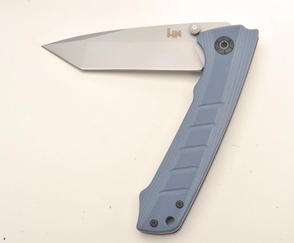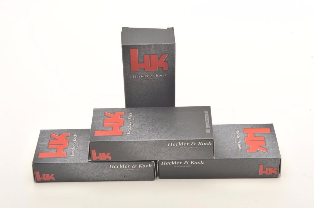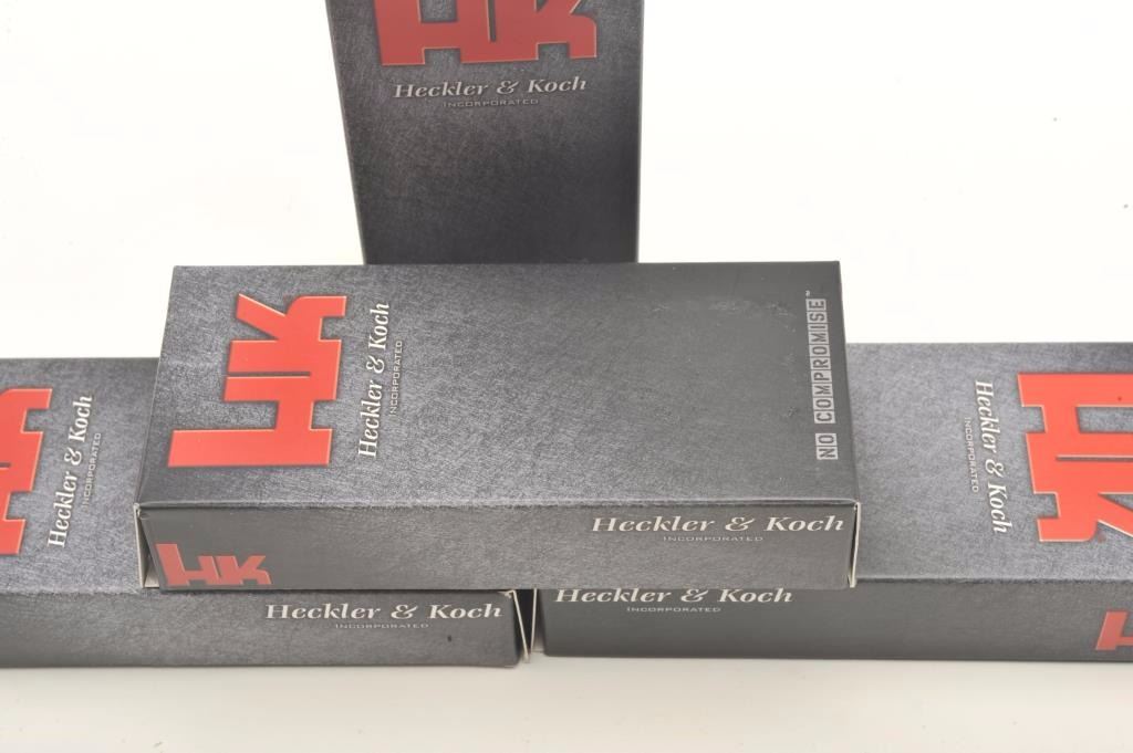 Lot of 4 HK (Heckler & Koch) folding knives, each new in a factory cardboard box with instructions; designed and manufactured in cooperation with Benchmade Knife Co., Inc. Est.: $100-$200.