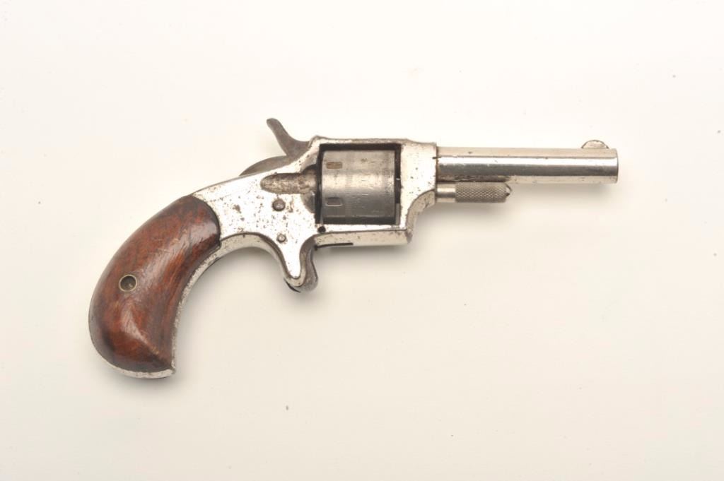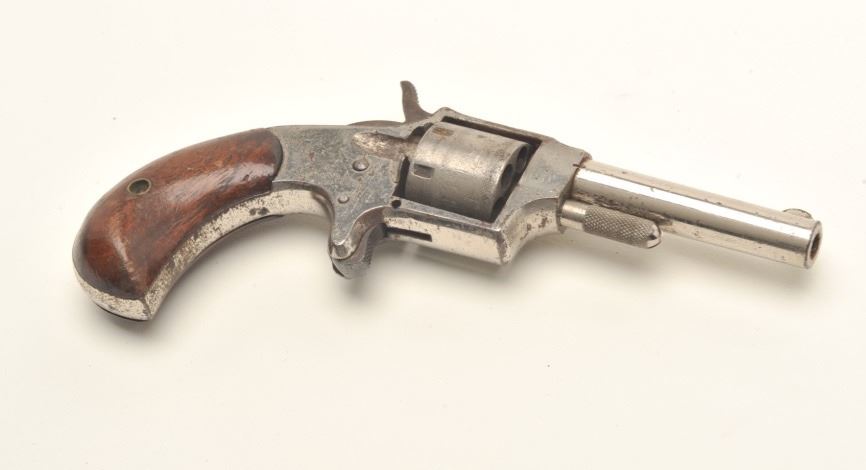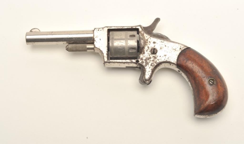 Spur trigger revolver marked “RANGER 22 LONG” on top of frame; .22Long caliber, 2.5” round barrel, nickel finish, wood grips, S/N 8957, in overall good condition with considerable original finish remaining and some spots oferosion, good markings and grips, action needs adjustment. (Antique). Est.: $125-$250.