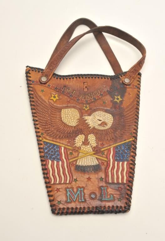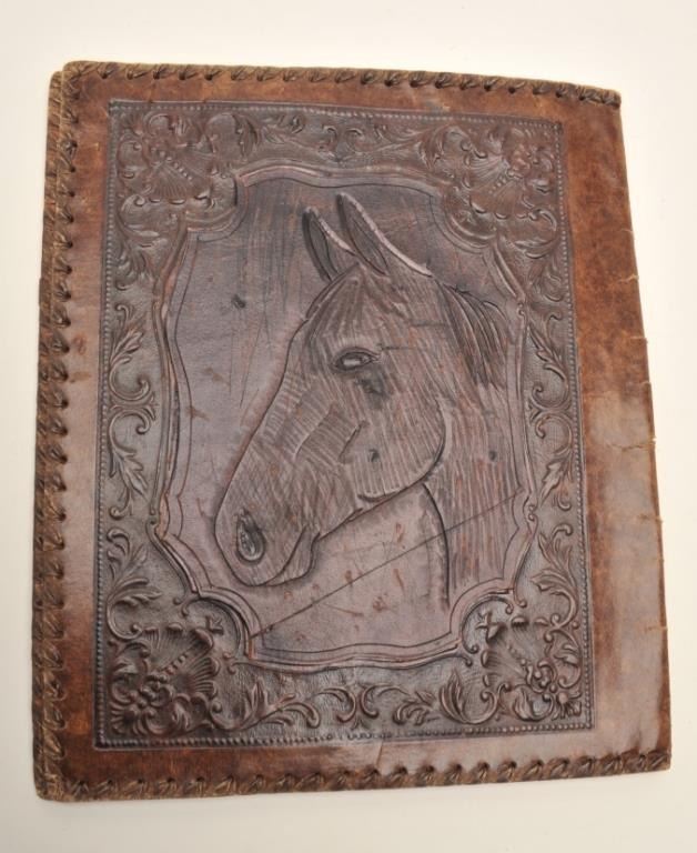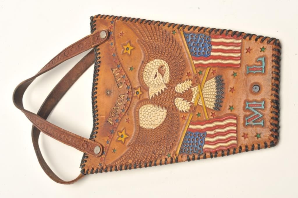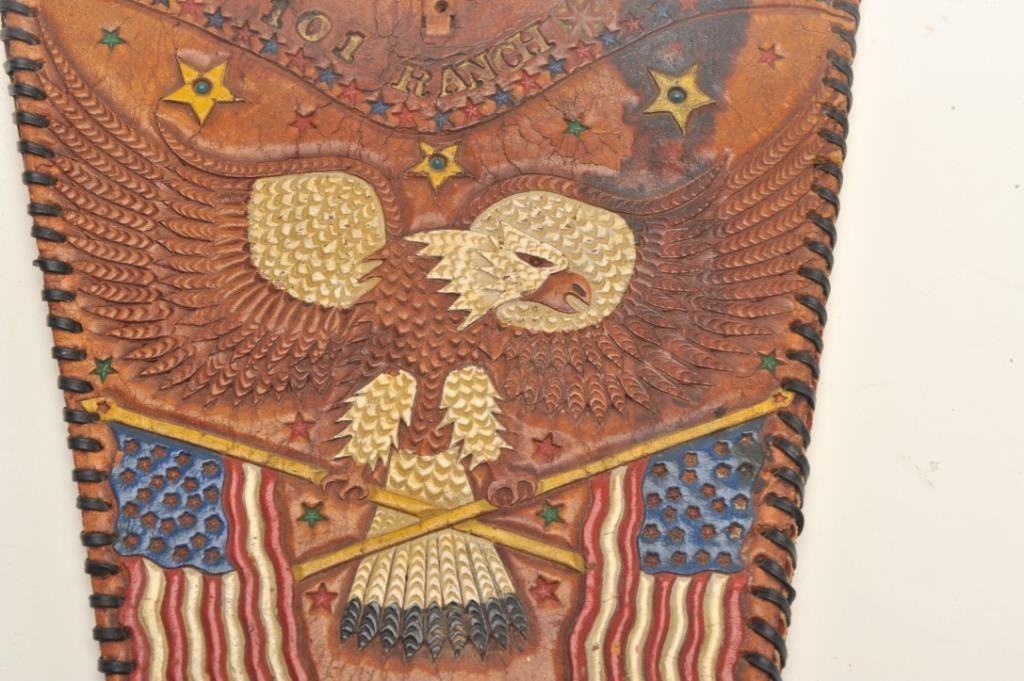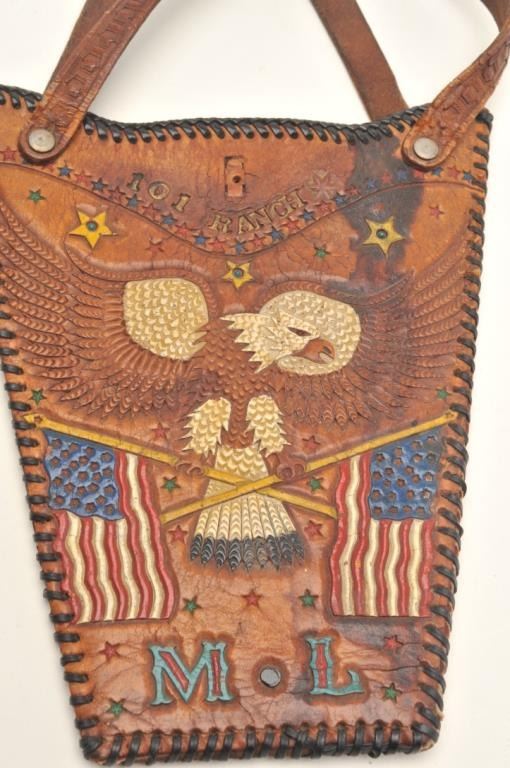 Lot of 2 items including a carved leather portfolio with “101 Ranch” on the front and the likeness of a horse head on the back, approximately 13” x 11” and a carved leather purse with American Eagle and flags; also“101 Ranch”, “Ponca City”, and “M L” designs, approximately 9” x 7”. Est.: $350-$700.
