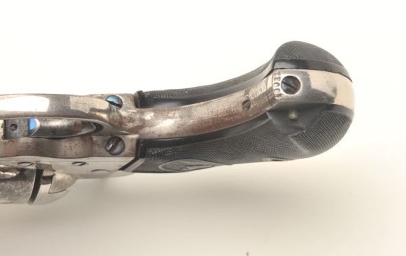 Colt Model 1877 Lightning DA revolver, .38 caliber, 3.5” ejectorless etched panel barrel, nickel finish, checkered hard rubber grips, S/N 40911, in overall good to very good condition displaying its completeoriginal etched panel, majority of original nickel finish with original niter blue finish on back of hammer and on some of the screw heads; action is working at time of description but the return spring is not;good markings, grips show an old loss at the front right toe. (Antique). Est.: $500-$1,000.