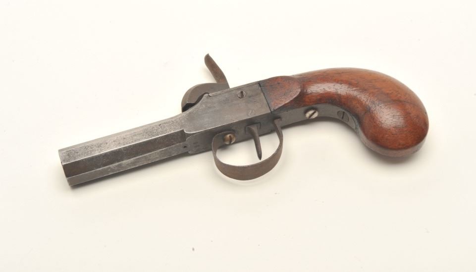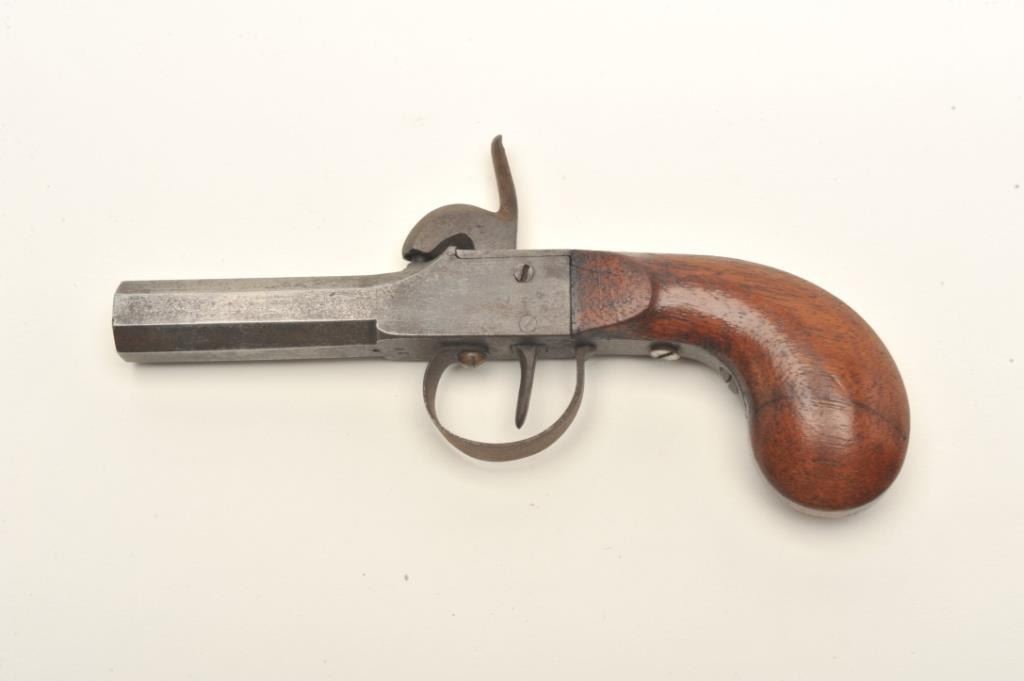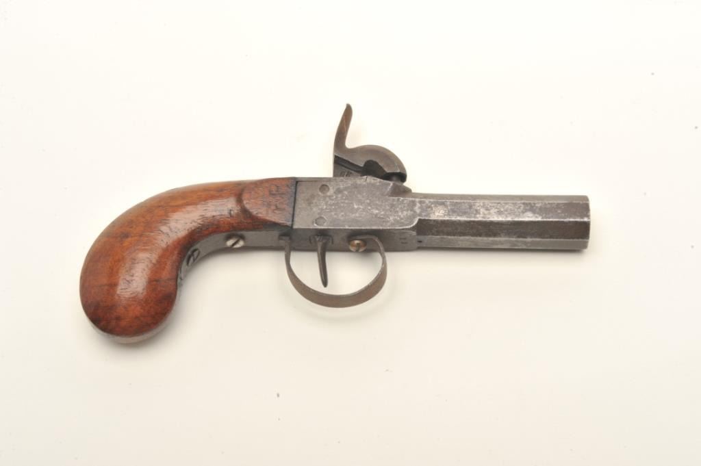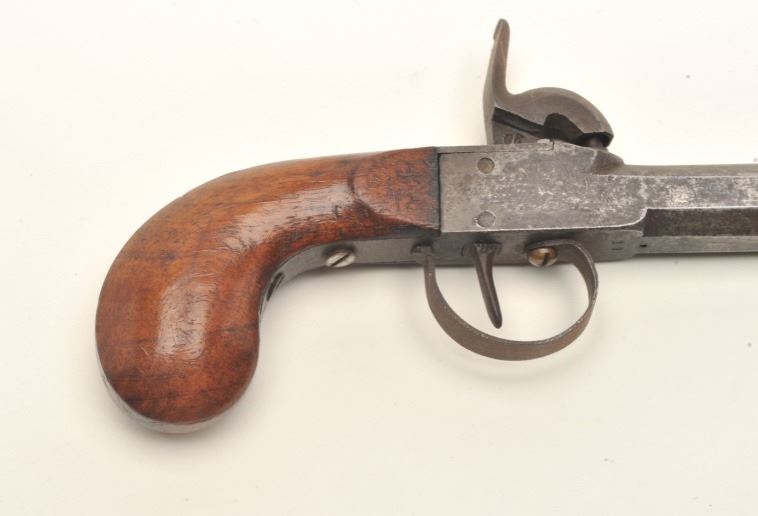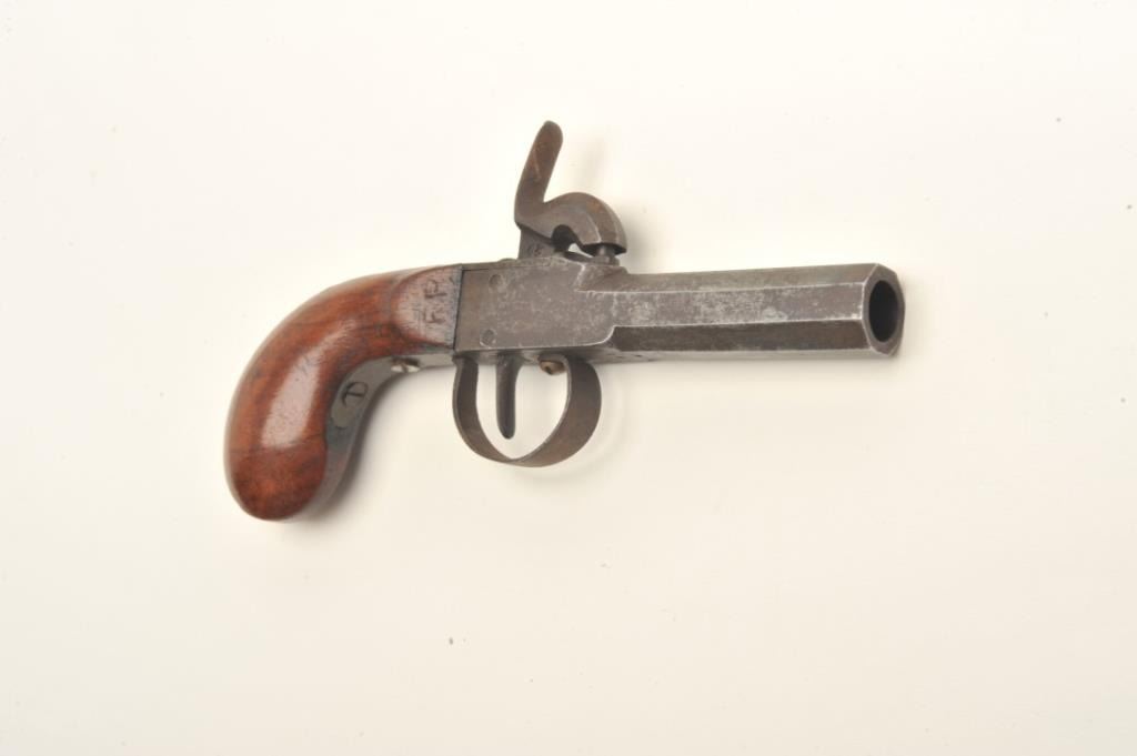 Lot 1336 Single shot percussion pistol, .45 caliber, 2.5” octagon barrel, wood grip, S/N 20; in overall goo