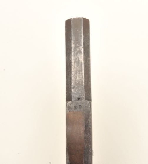 Single shot percussion pistol, .45 caliber, 2.5” octagon barrel, wood grip, S/N 20; in overall good condition with a dark patina to metal surfaces, good action and grips. (Antique). Est.: $100-$200.