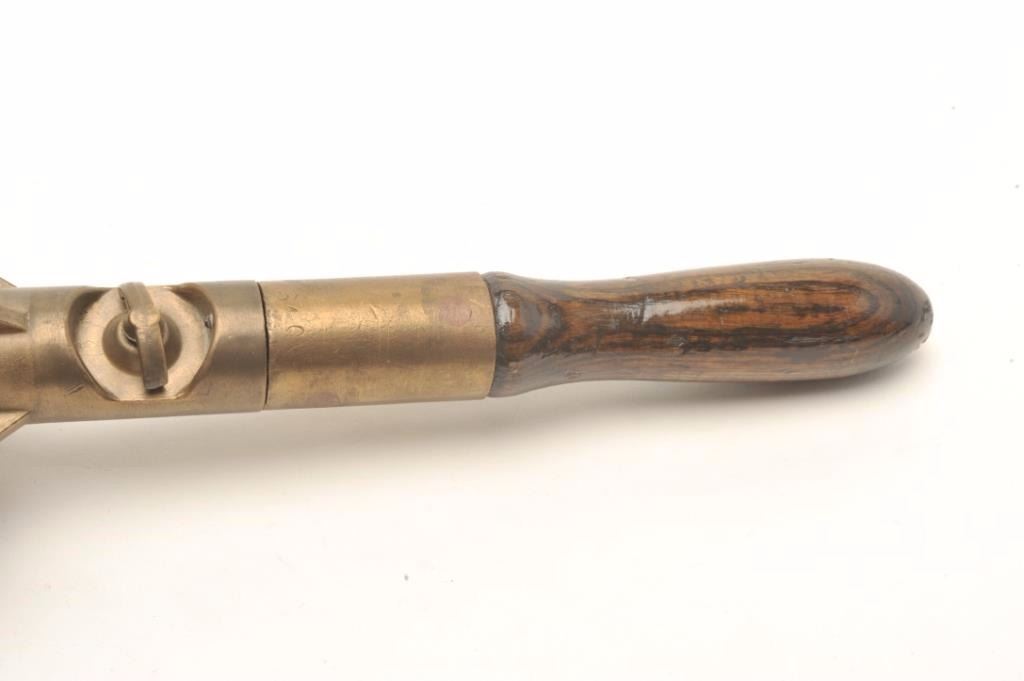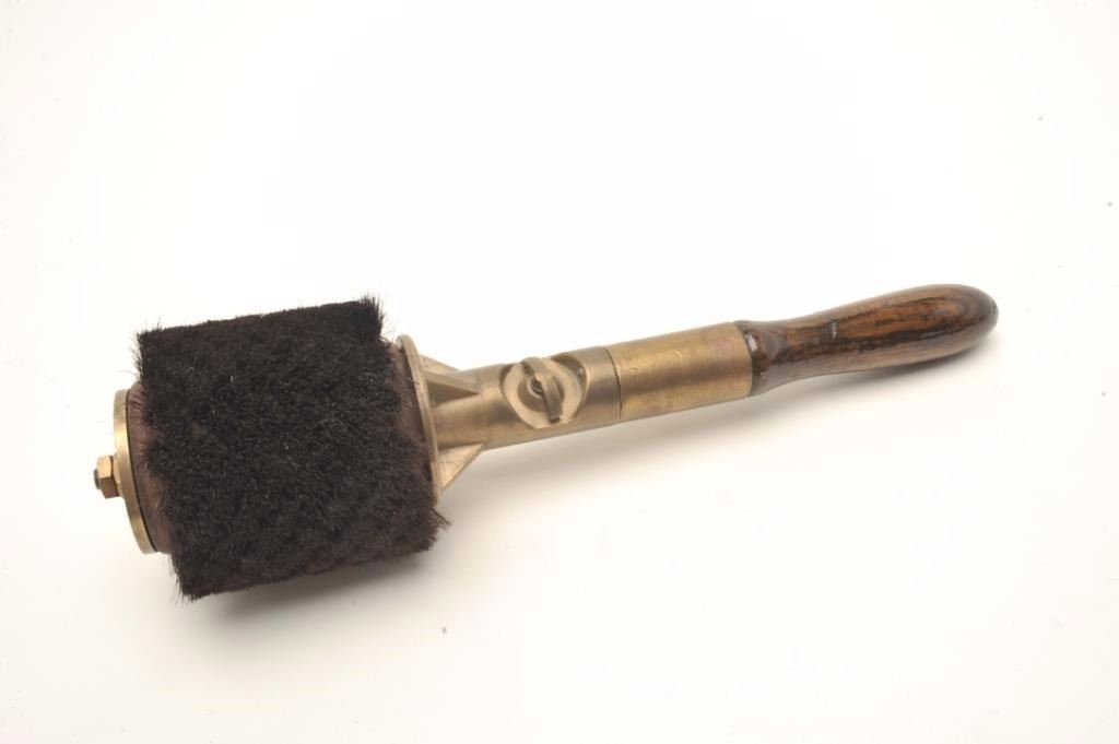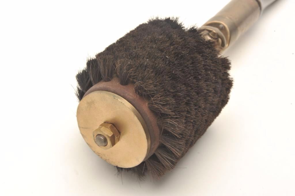 British barrel cleaning brush from the ship HMS Arot Royal (R09), approximately 6” in diameter (brush head) with wood handle and approximately 20.5” long. Est.: $100-$200.