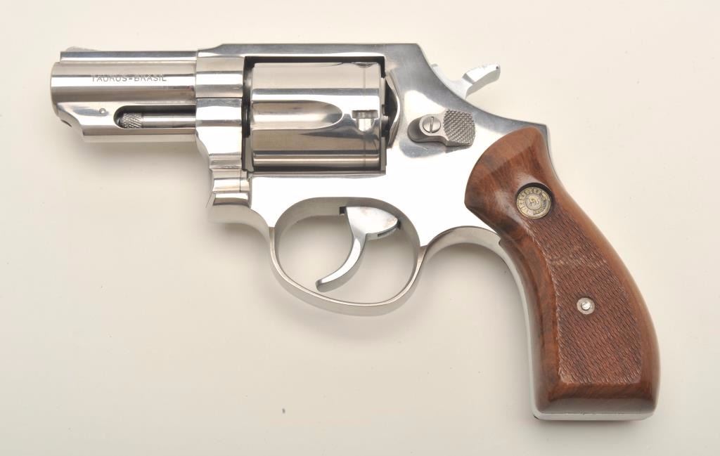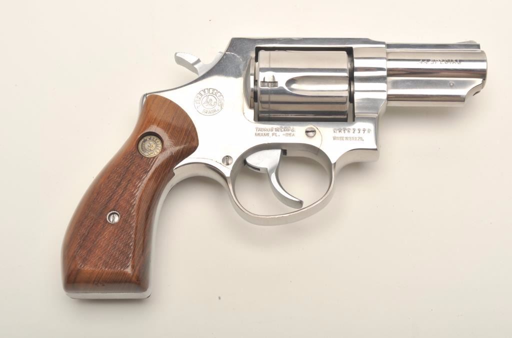 Taurus revolver, .44 Special caliber, serial #162378. The revolver is in very good overall condition with a 2 ½” barrel. The pistol retains nearly all of its polished nickel finish with slight at the muzzle andalong the base of the trigger guard. The checkered medallion wood grips are in very good condition as well with some slight flattening of the checkering. The bore is very good, the action is crisp and themarkings are sharp. Est.: $150-$300.