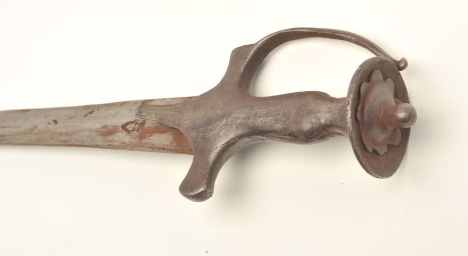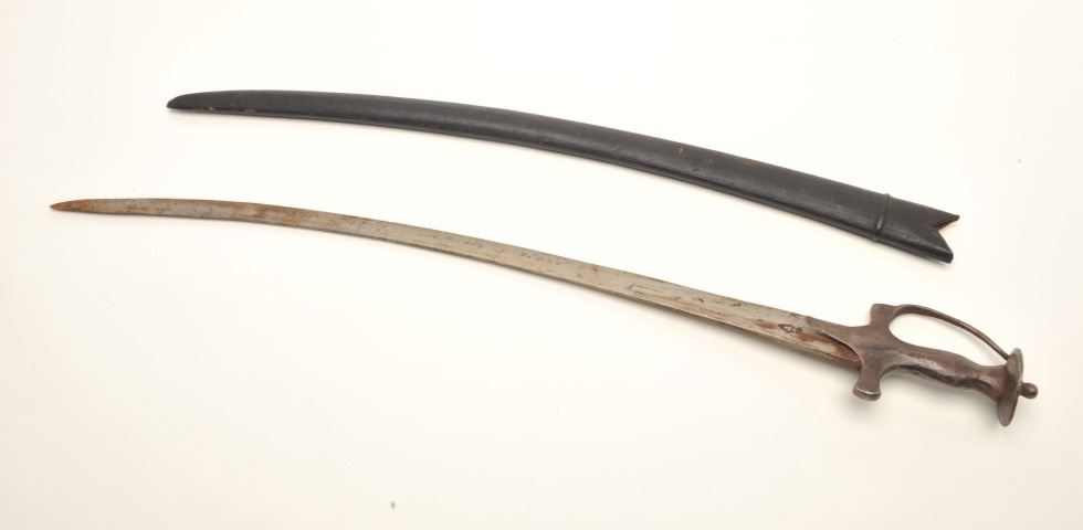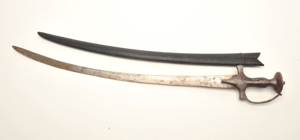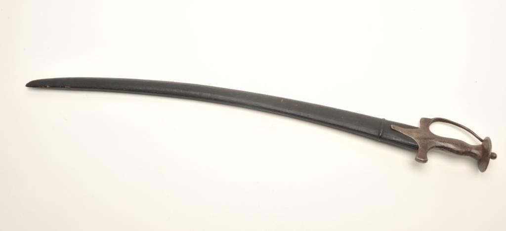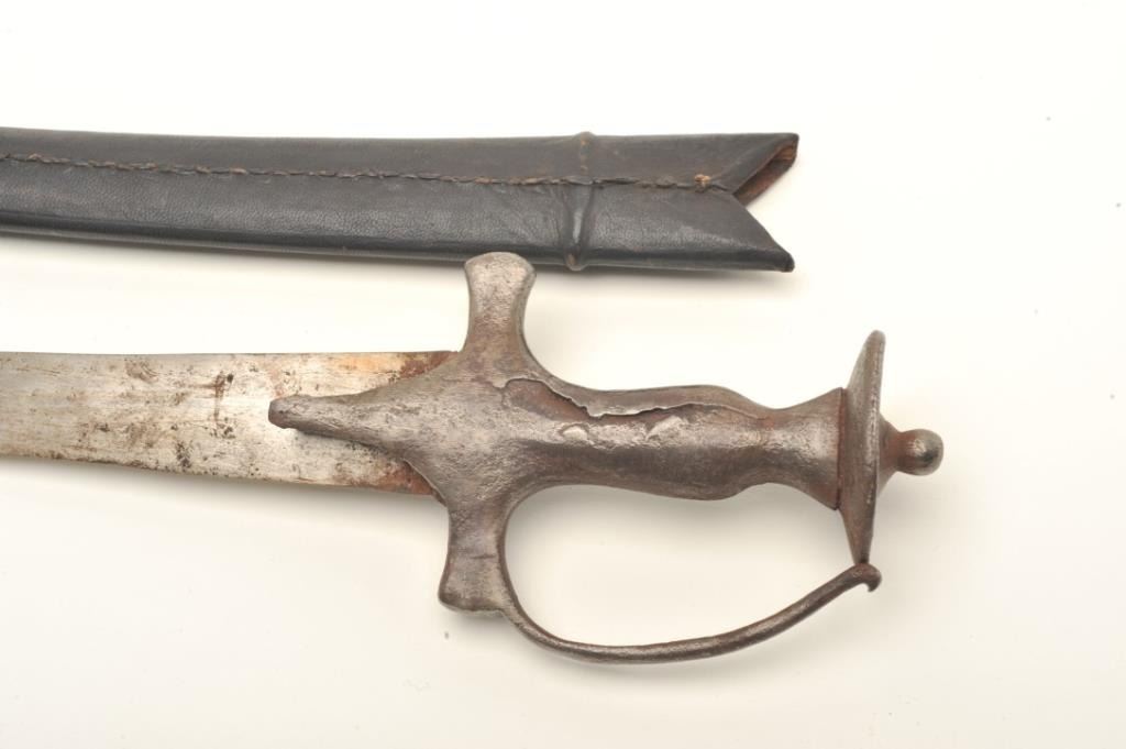 Tulwar sword with scabbard, approximately 31” overall with a 26” blade; some surface rust to blade; good scabbard. Est.: $100-$200.