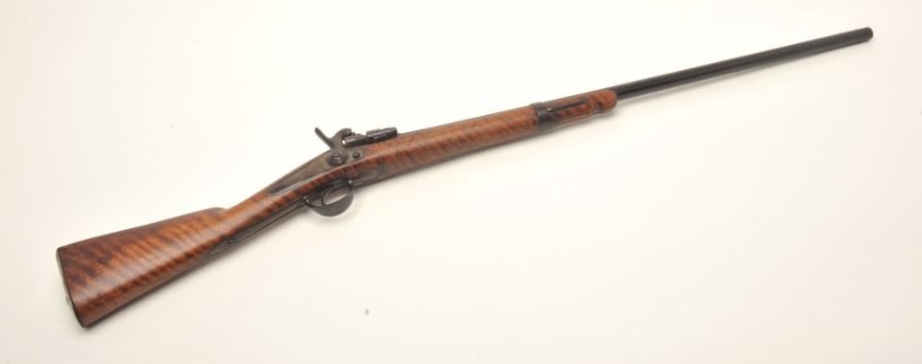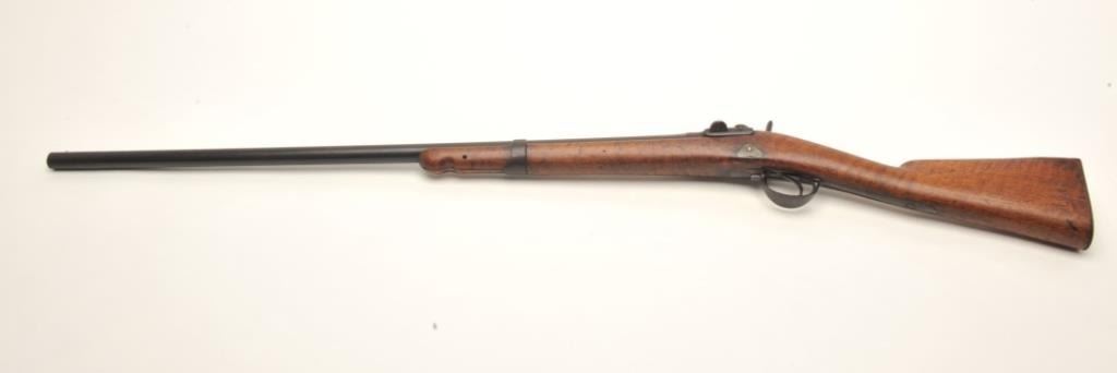 Percussion single shot shotgun, approximately 10 gauge, serial #NSNV. The shotgun is in good overall condition with a 32” barrel. The barrel and action show trace amounts of blue with the remainder having gone topatina. The barrel address reads, “Zulu”. The smooth wood stock is a cut military issue with small mars and dents from use. The butt stock ends with a smooth, metal butt plate. The bore is good, the actionfunctions and the markings are legible. Est.: $125-$175. (Antique).