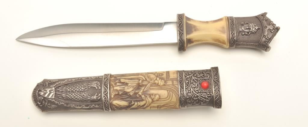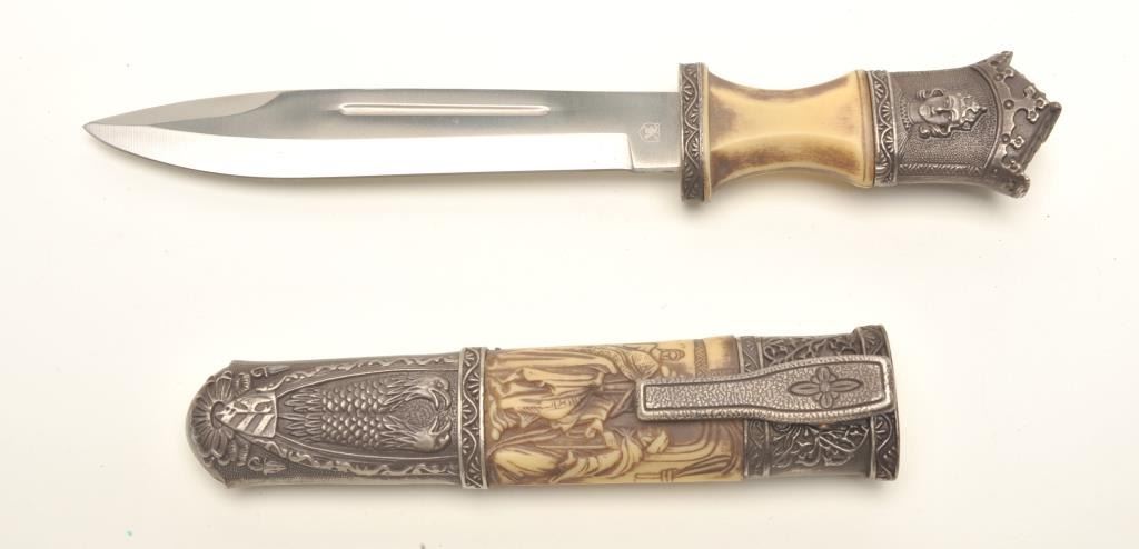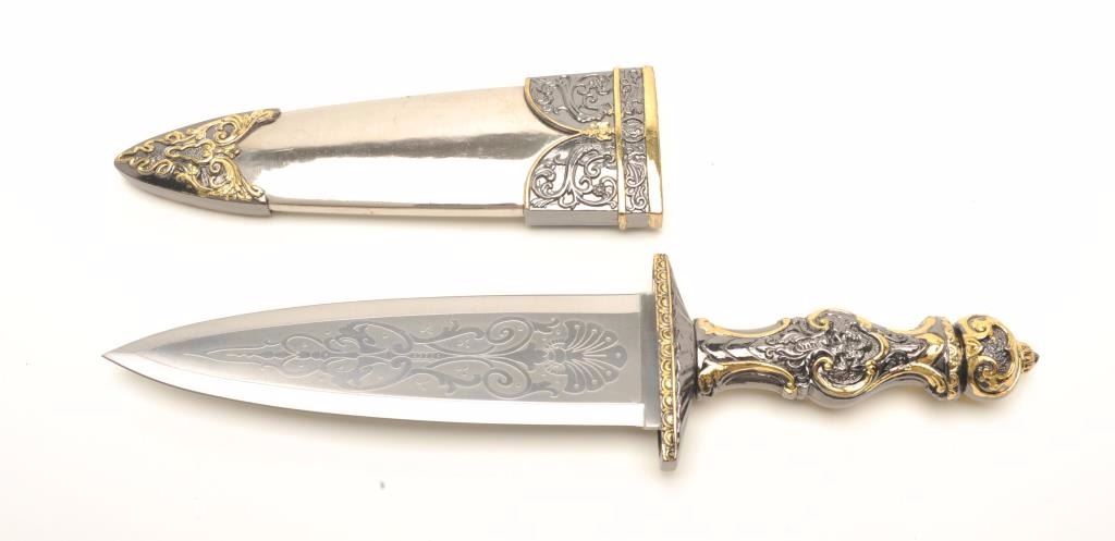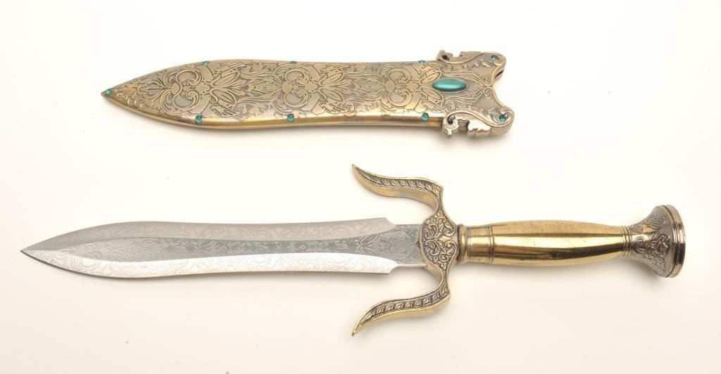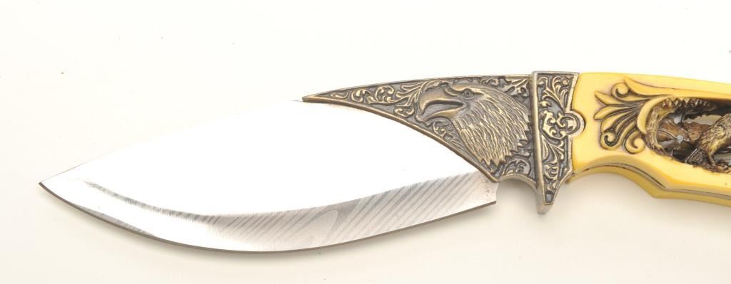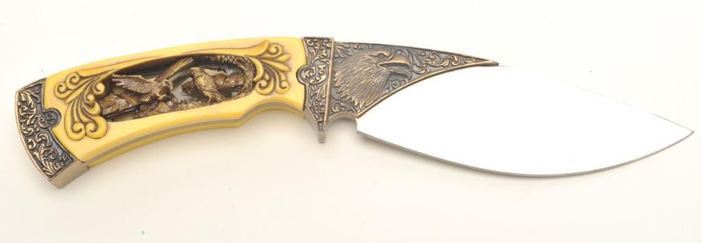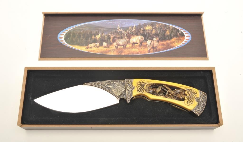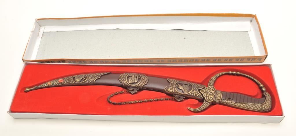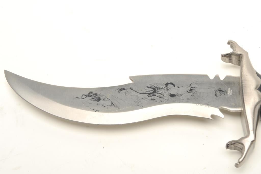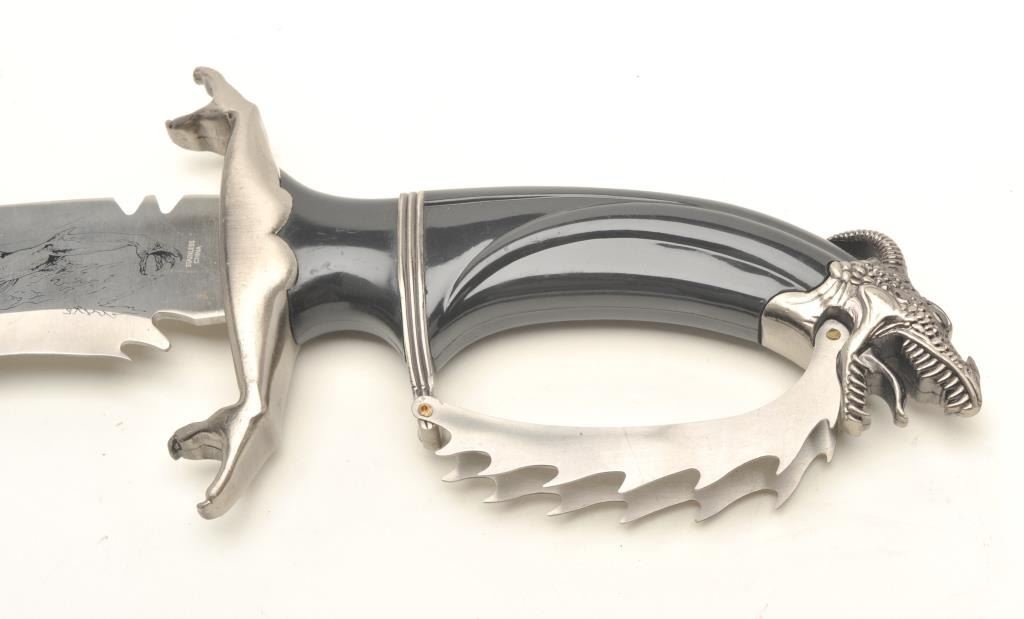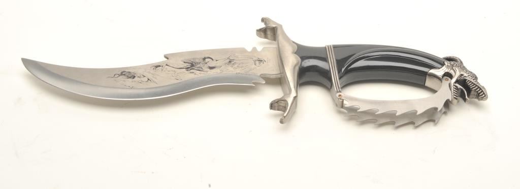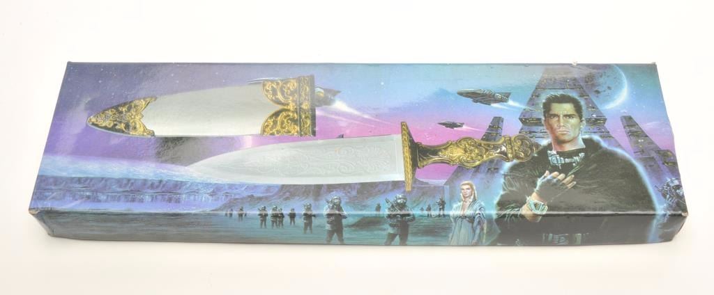 Lot 1377 Lot of 8 modern fantasy knives; 7 in boxes, 1 without box plus a woven Mexican blanket. Est.: