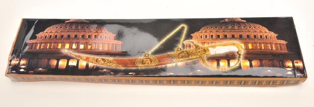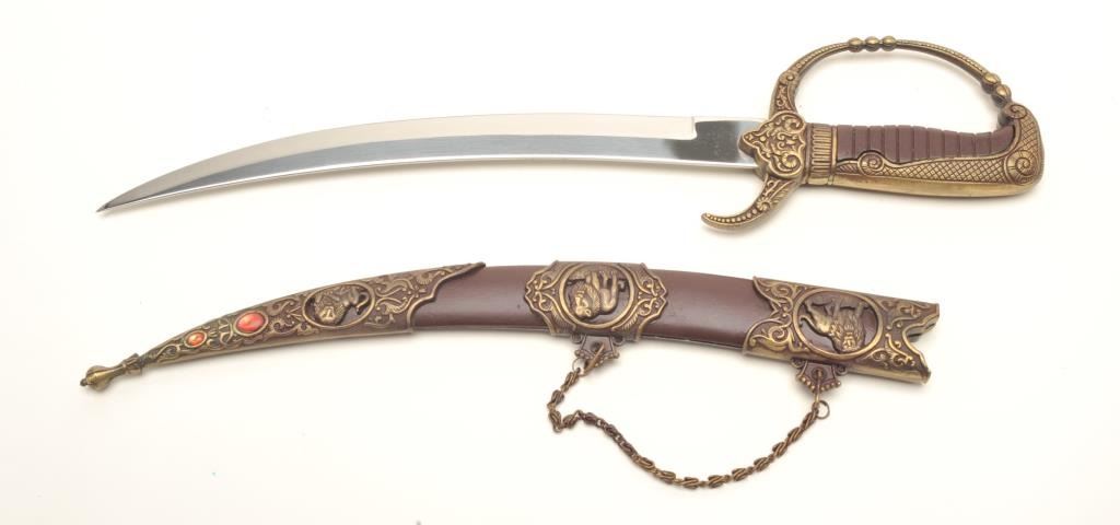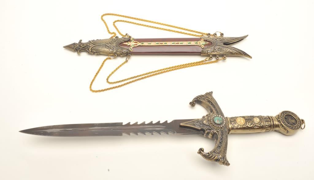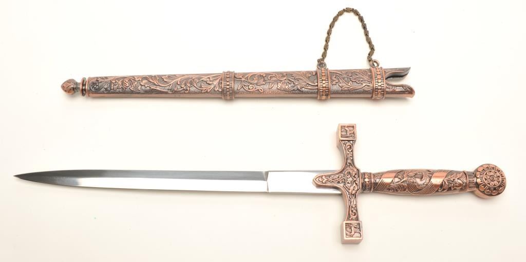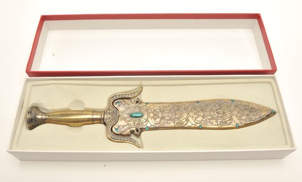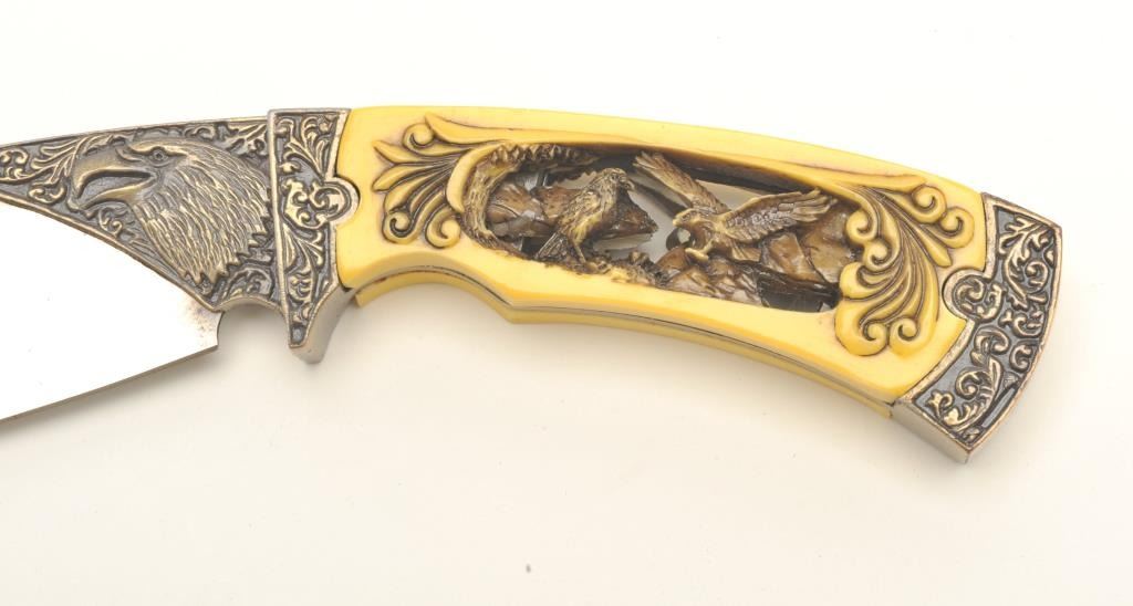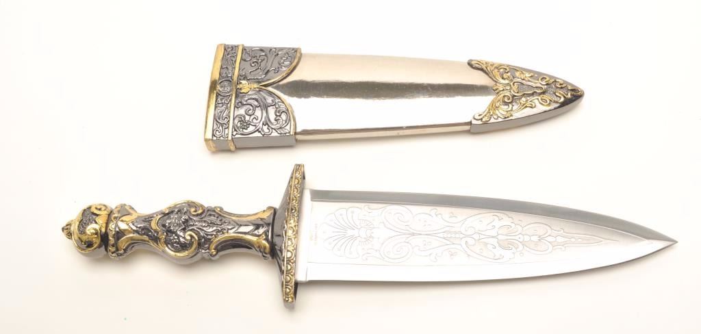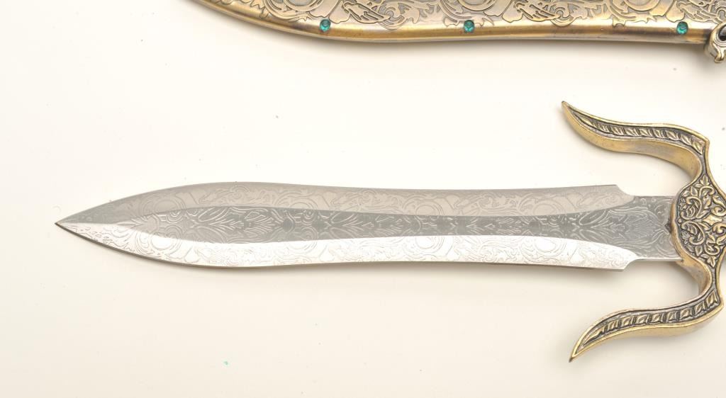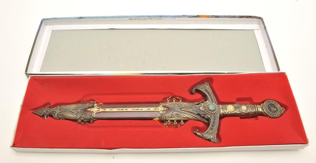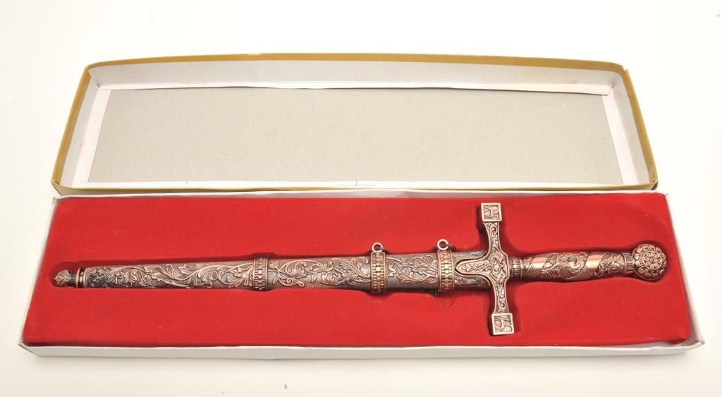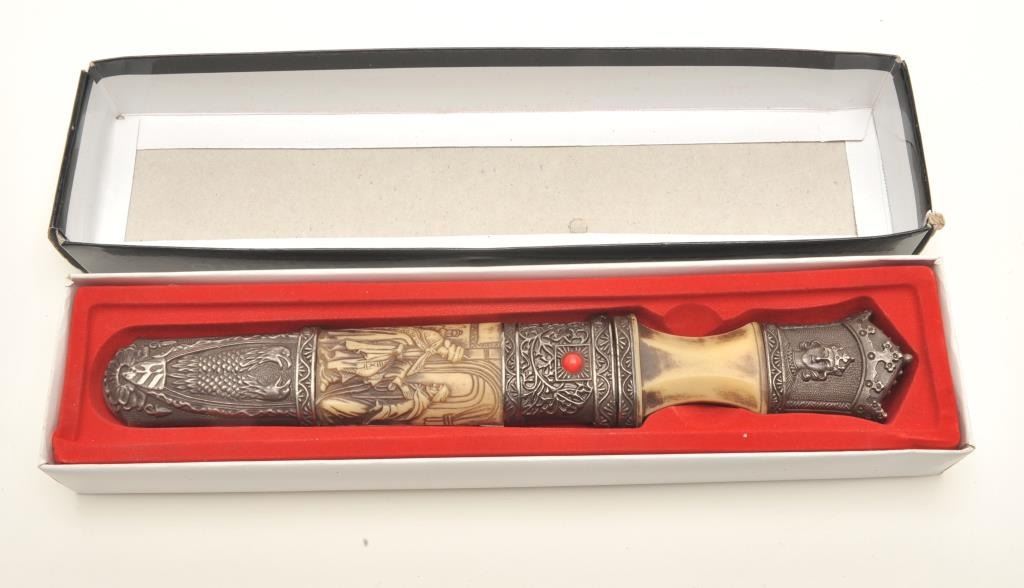 Lot 1377 Lot of 8 modern fantasy knives; 7 in boxes, 1 without box plus a woven Mexican blanket. Est.: