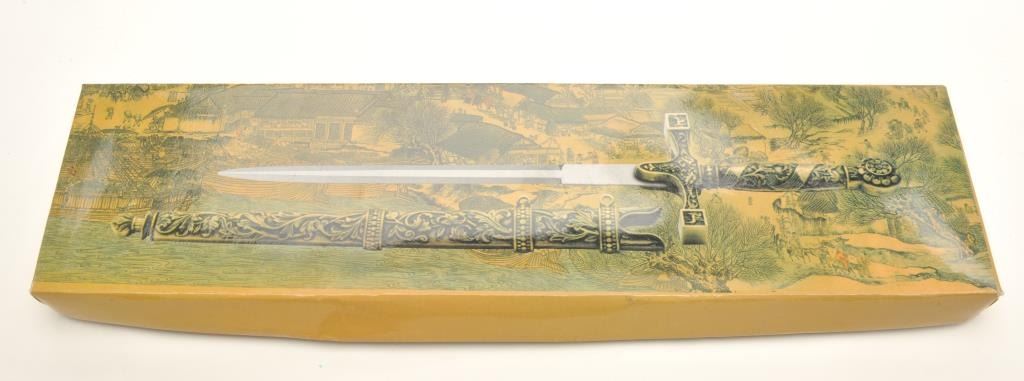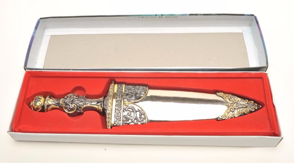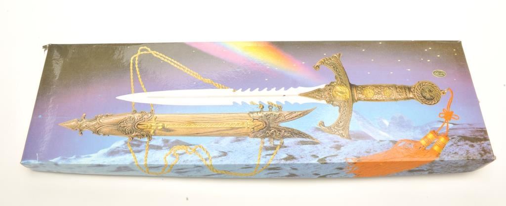 Lot of 8 modern fantasy knives; 7 in boxes, 1 without box plus a woven Mexican blanket. Est.: $80-$160.