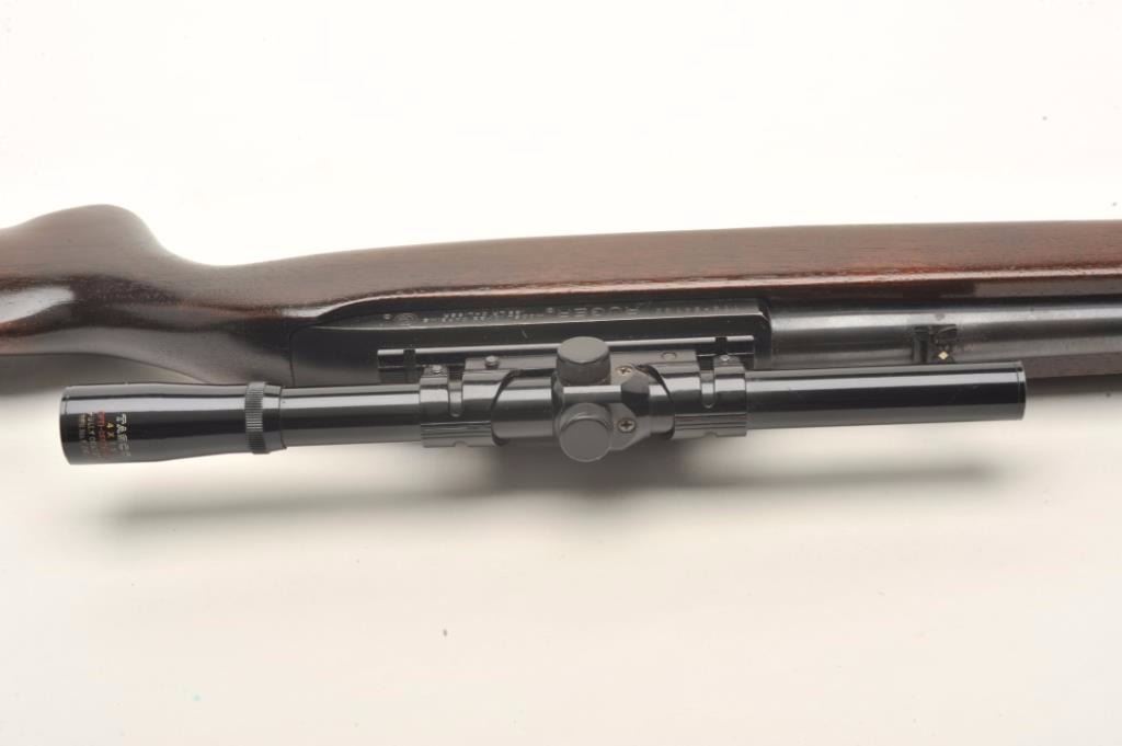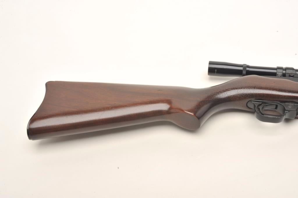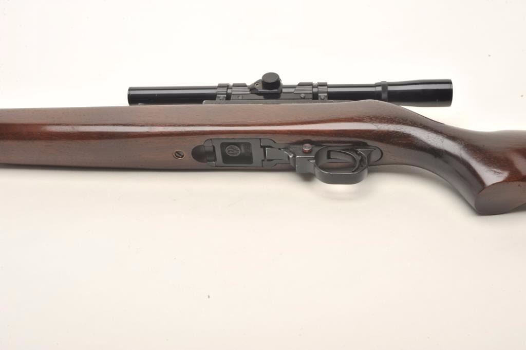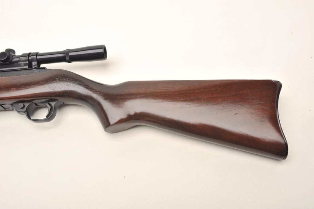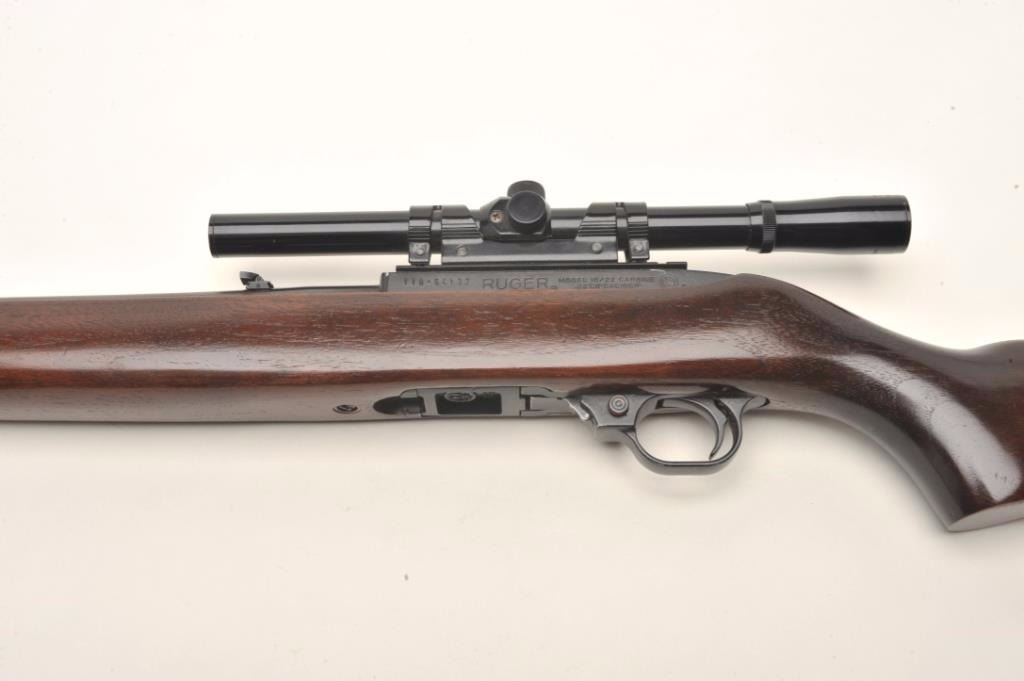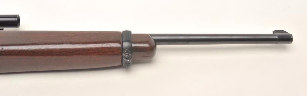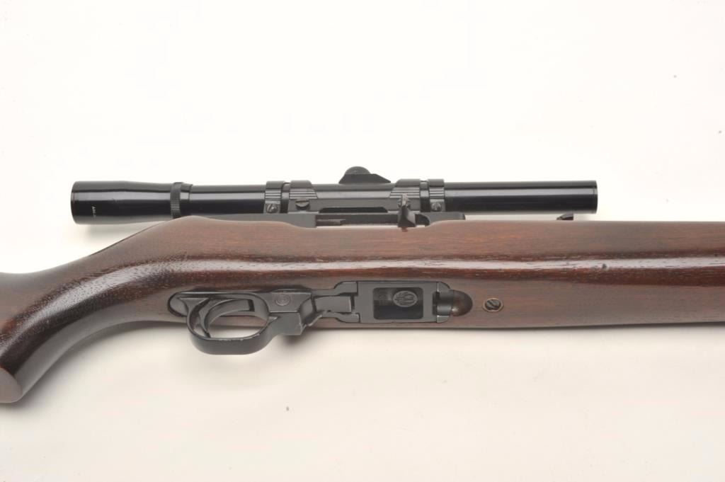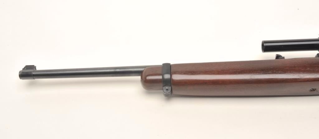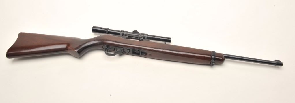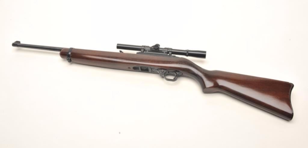 Ruger Model 10-22 semi-auto rifle, .22 caliber, serial #118-54132. The rifle is in very good overall condition with an 18” barrel with post front and folding rear sights. The barrel and action retain themajority of their blued finish with only light handling marks. The smooth wood stock is in very good condition with a smooth metal butt plate. The rifle is topped with a Tasco 4x15 fixed power scope. The bore isgood, the action crisp and the markings are sharp. The rifle comes with one correct magazine. Est.: $100-$200.