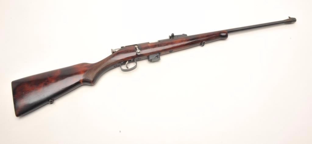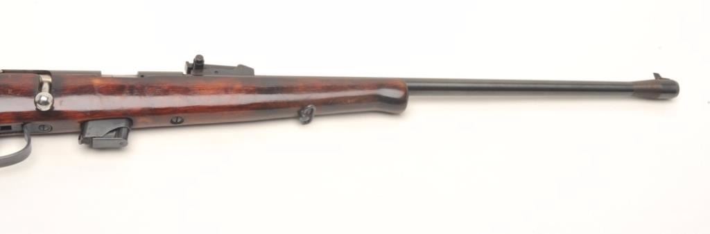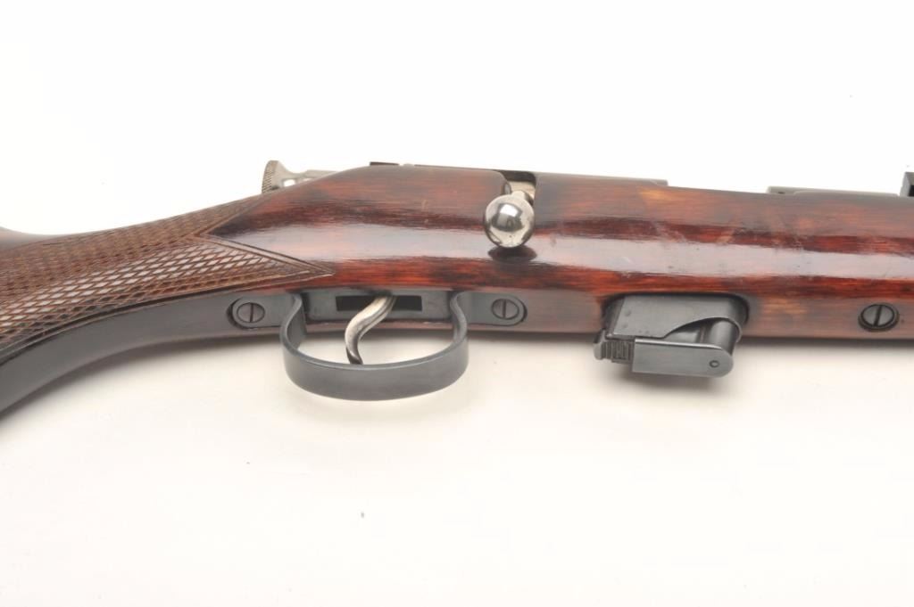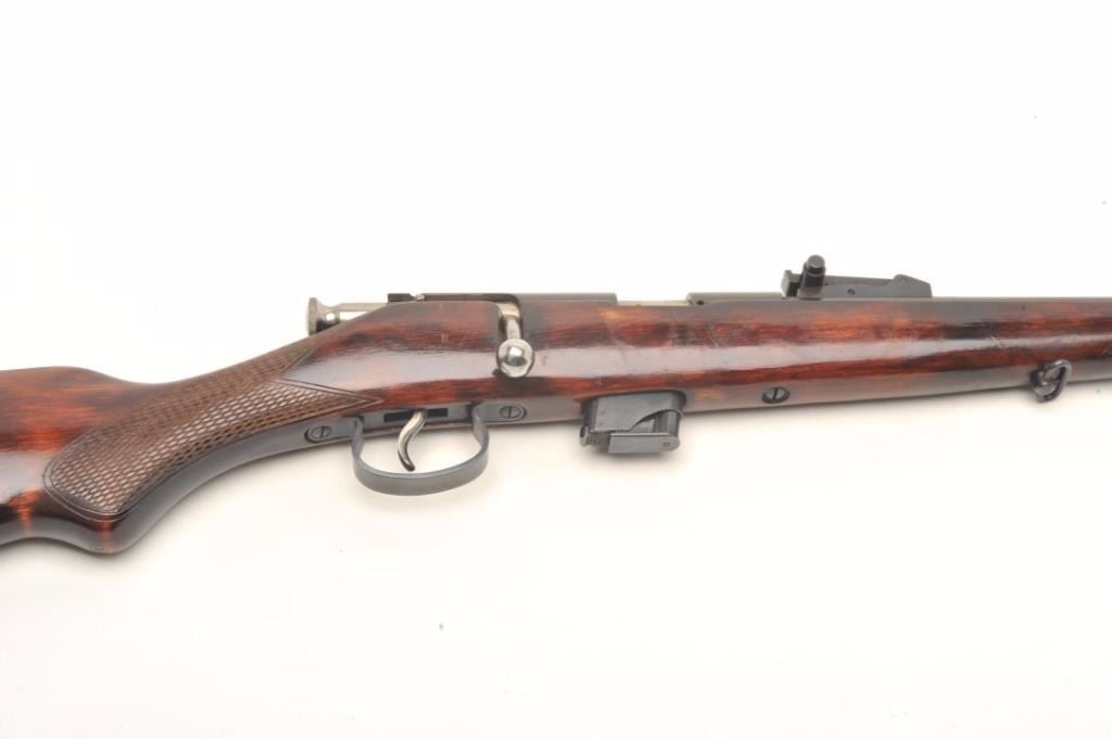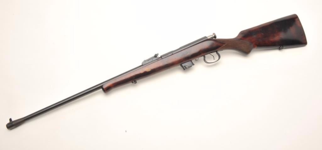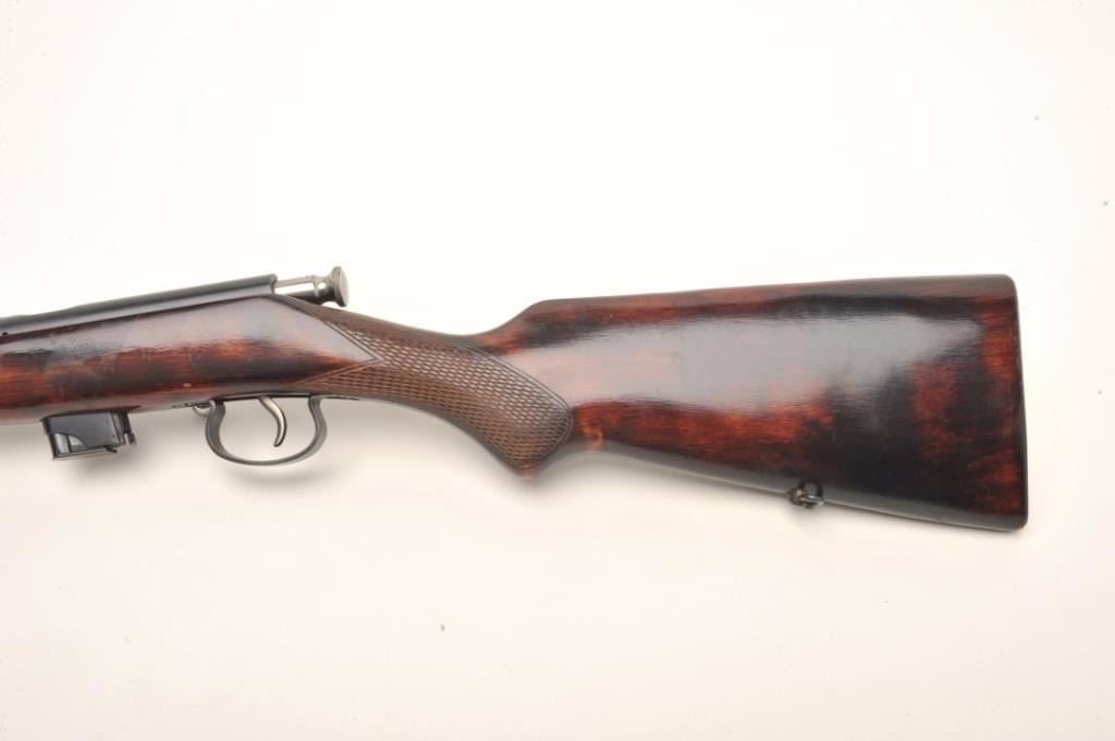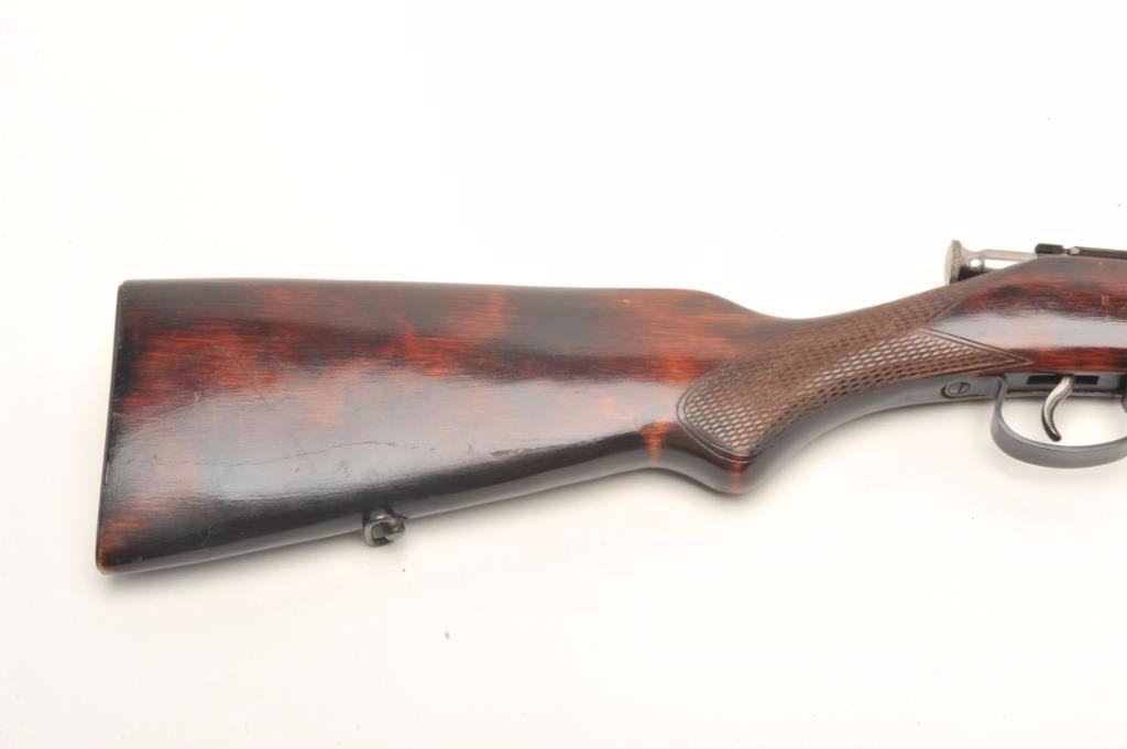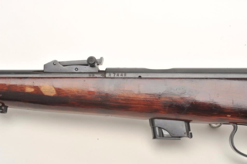USSR bolt action rifle, .22 LR caliber, serial #A7448. The rifle is in good overall condition with a 21” barrel. The barrel and receiver retain the majority of their blued finish with light surface rust noted at themuzzle. The checkered wood stock is in good condition with small mars from use and a smooth metal butt plate. The bore is good, the action crisp and markings are legible. Est.: $60-$120.