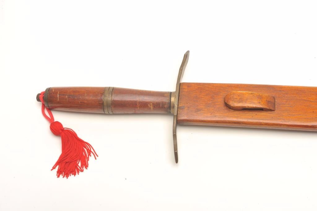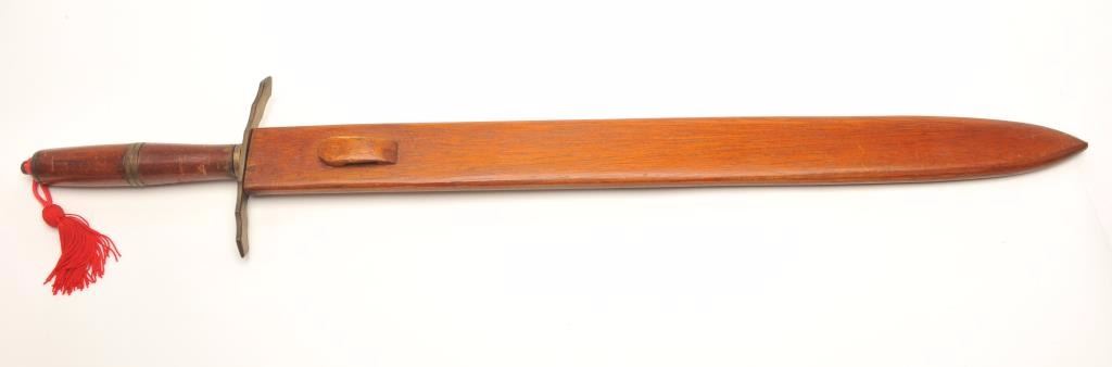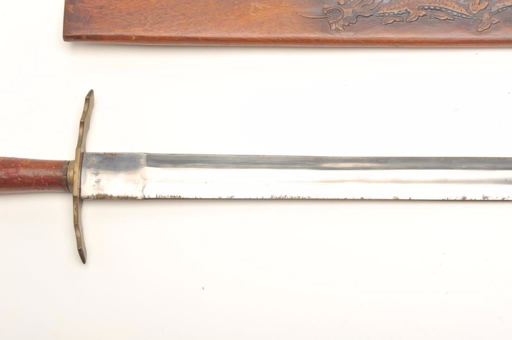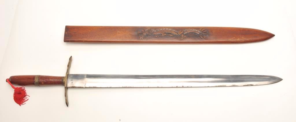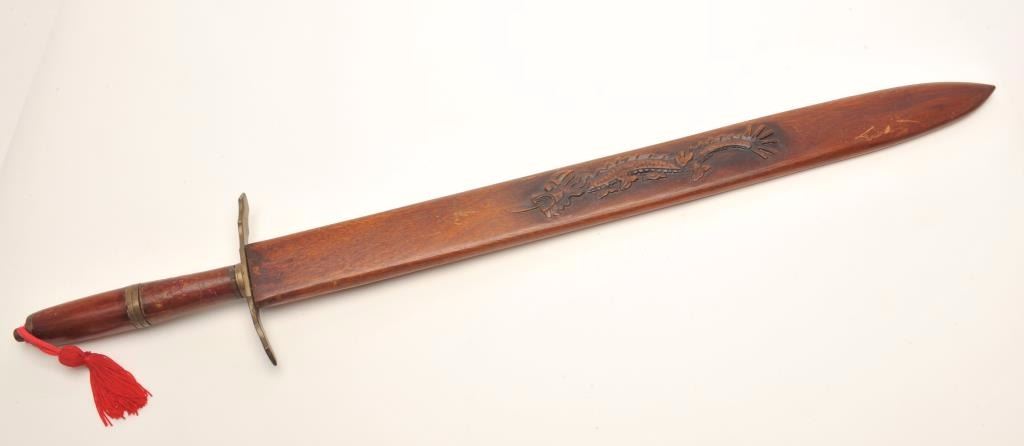 Modern Chinese sword with carved wooden scabbard, approximately 36” overall with a 28” blade. Est.: $35-$50.