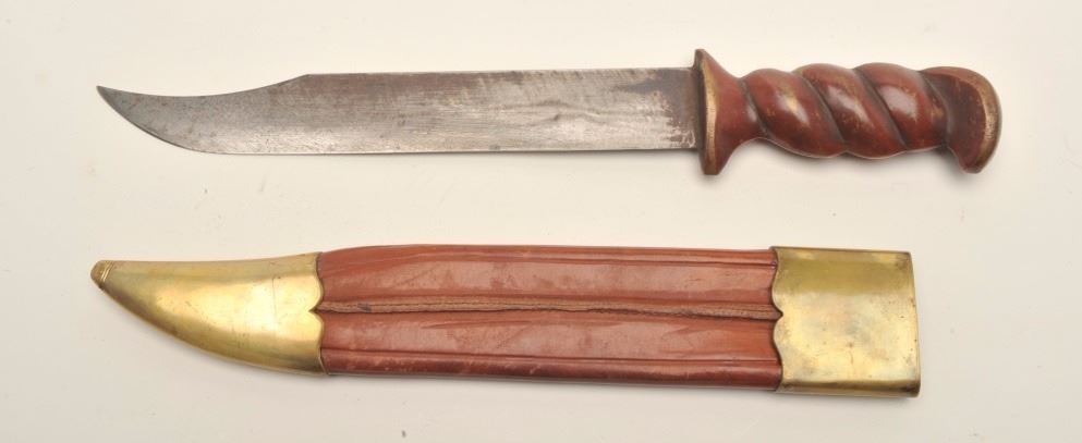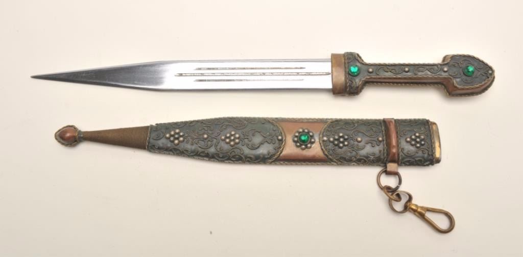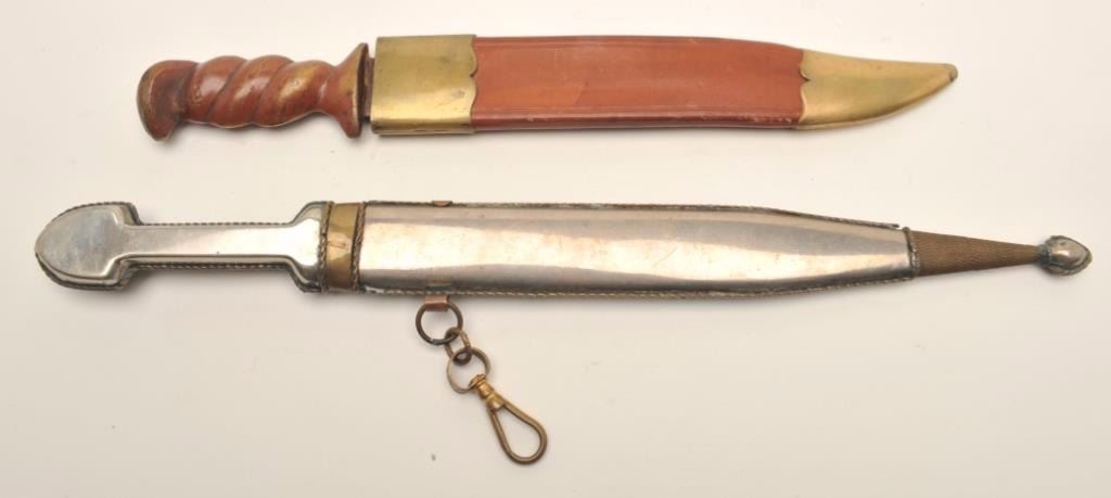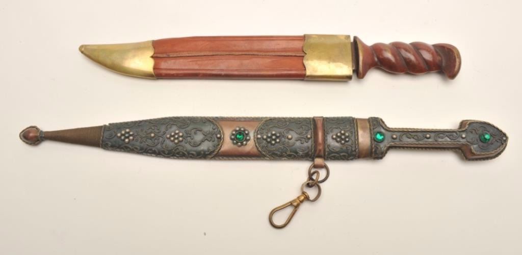 Lot of two theatrical knives. The lot includes a Russian Kenjal which is 16 ½” in length with an 11” blade. The blade shows light scratches from the scabbard and no sharpening. The handle is completed in somewire scroll with two faux gemstones. The scabbard is similarly done with the addition of wire wrap at the toe. The second knife is meant to depict an early European style with an 8 ½” clip point Bowie style blade and anoverall length of 12 ¾”. The handle is brass painted to resemble wood and the scabbard is leather with brass at the throat and the toe. Est.: $50-$100.