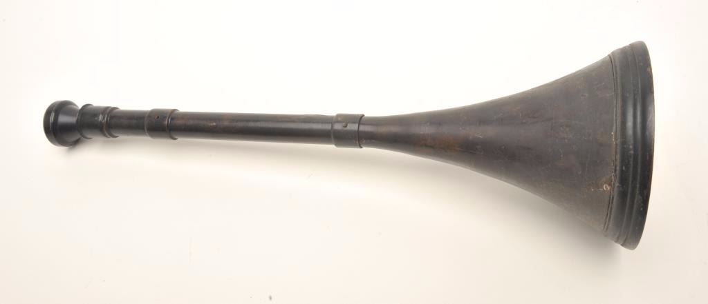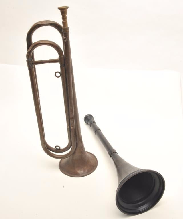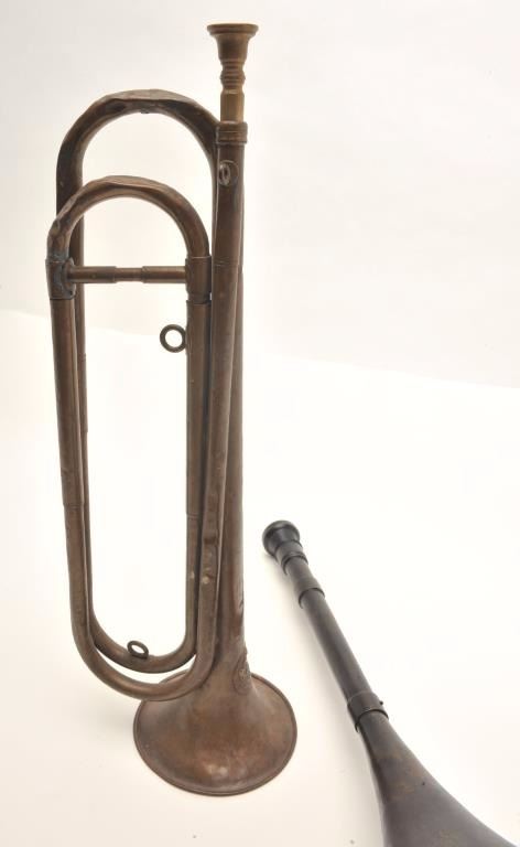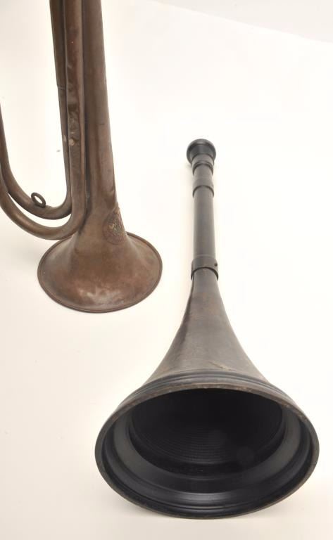 Lot 1393 Lot of two bugles. The lot includes one unmarked heavy iron bugle with a dark patina. The second