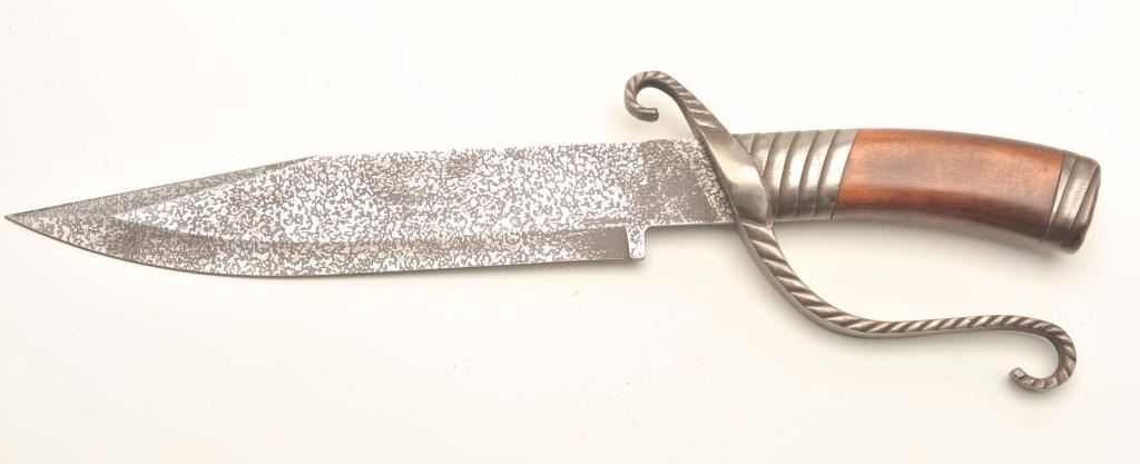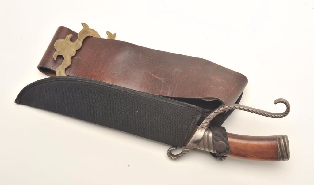 Theatrical short sword, approximately 15” overall with a 10” blade accompanied by a wide leather belt, brass buckle and later woven black sheath. Est.: $100-$150.
