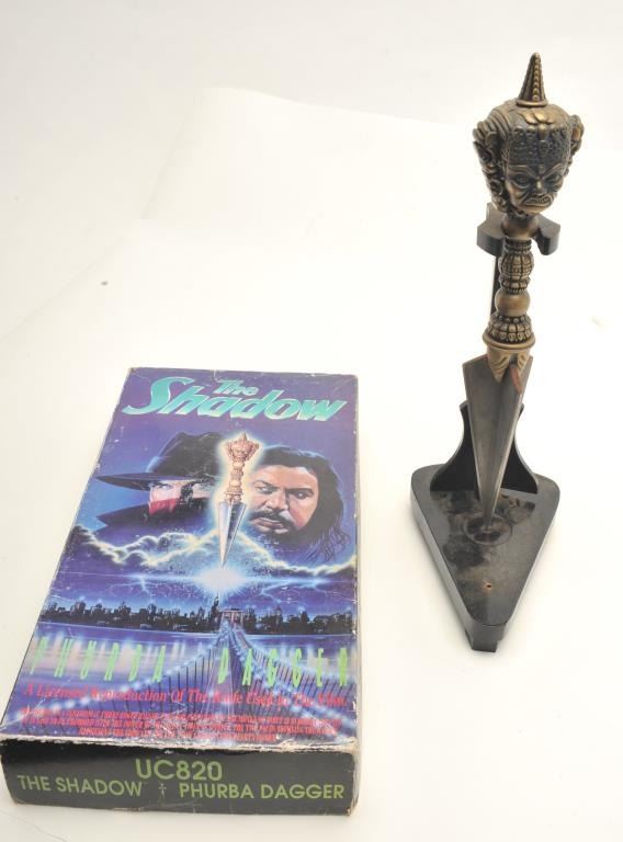 Reproduction of a Phurba Dagger, approximately 13.5” overall with display stand in cardboard shipping box that states “a licensed reproduction of the knife used in the film “The Shadow”. Est.: $35-$50.
