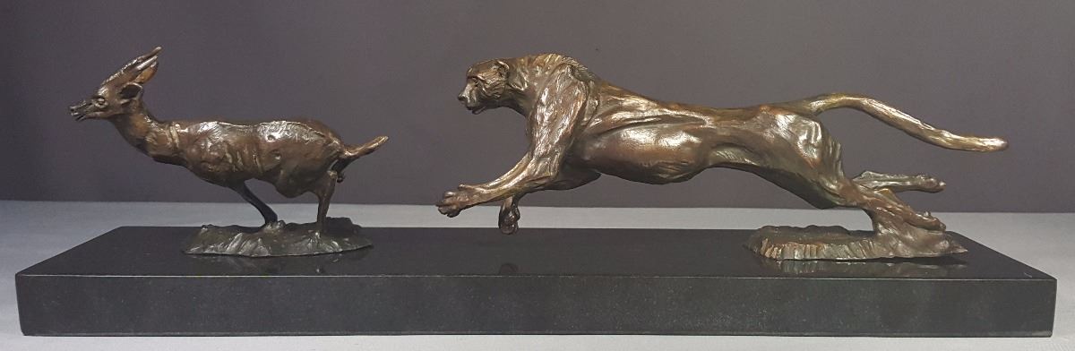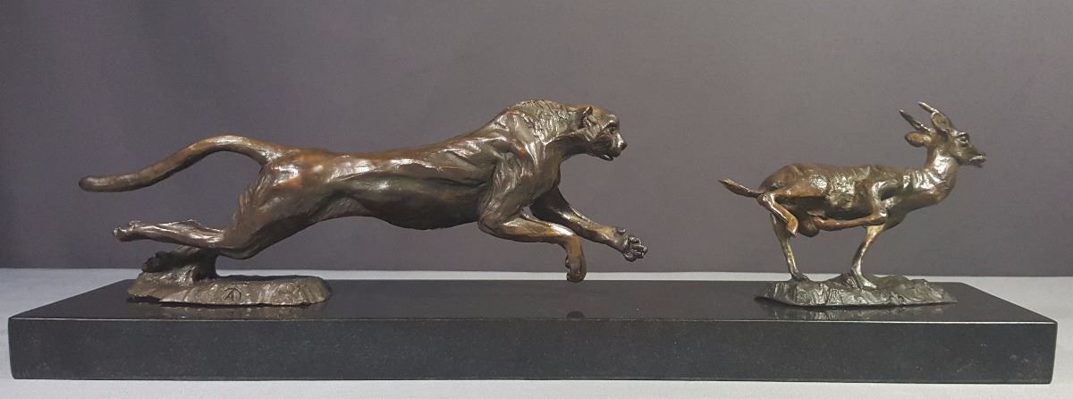 The sculpture shows a Cheetah in full flight chasing a Bush buck